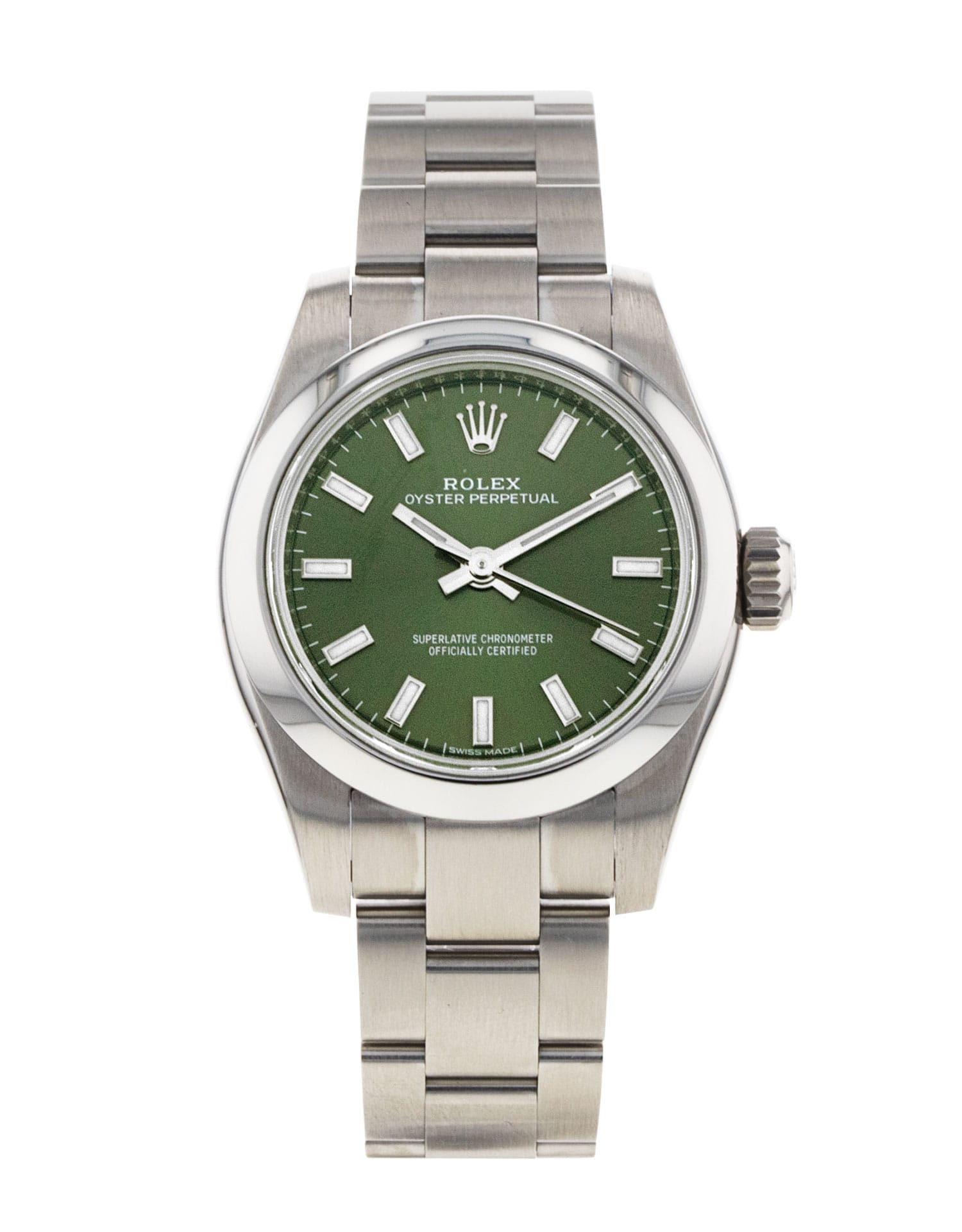 This Rolex Lady Oyster Perpetual 176200 has a green baton dial and a bracelet strap. This Rolex has undergone a thorough inspection of water resistance, accuracy, functionality and condition to determine the level of reconditioning required to meet our strict standards. It has also been referenced against technical documents and manufacturer records where available to ensure authenticity and a clean history. All our watches have a 24-month warranty for your peace of mind. One of our skilled polishing technicians has removed marks on the case and bracelet of this watch, brought about by daily wear and tear, which is why this watch does not come with the remaining manufacturer’s warranty.