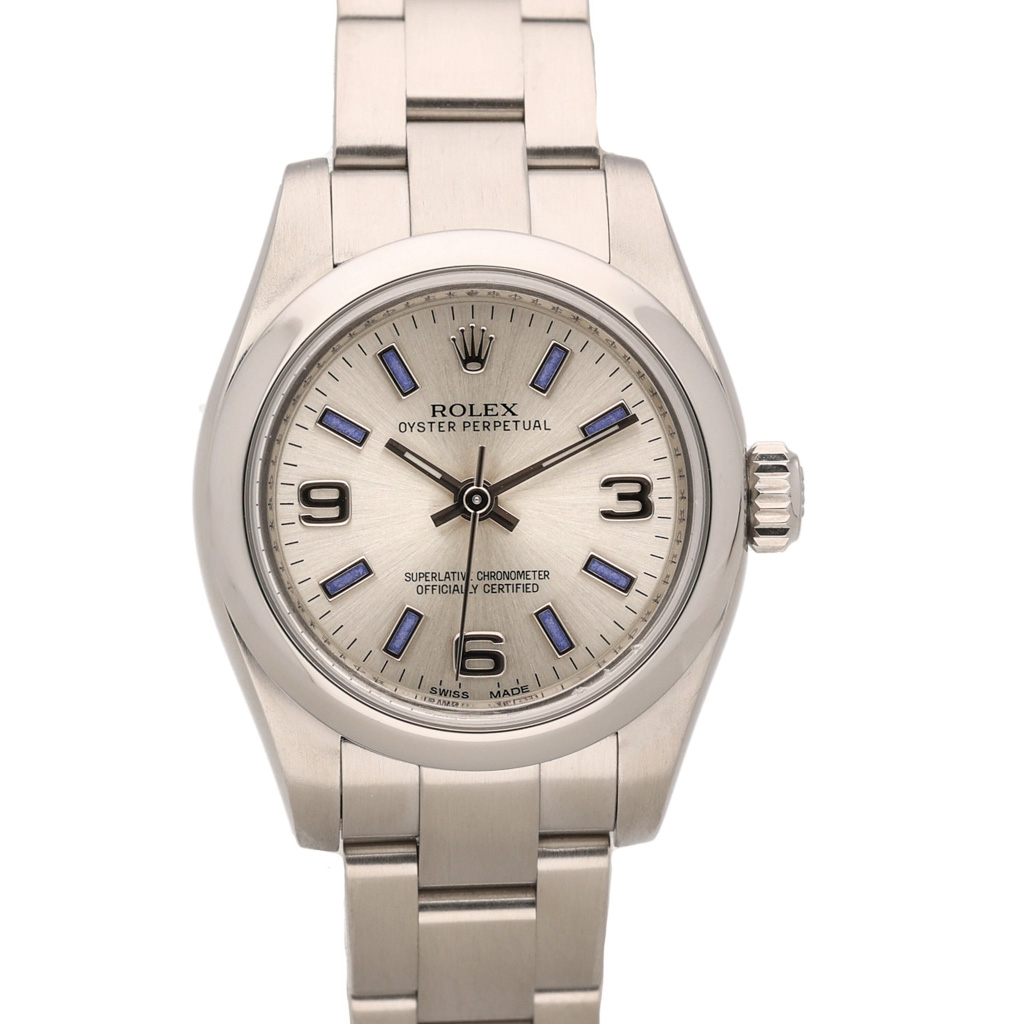 This Rolex Lady Oyster Perpetual 176200 has a silver quarter arabic dial and a bracelet strap. This Rolex has undergone a thorough inspection of water resistance, accuracy, functionality and condition to determine the level of reconditioning required to meet our strict standards. It has also been referenced against technical documents and manufacturer records where available to ensure authenticity and a clean history. All our watches have a 24-month warranty for your peace of mind. One of our skilled polishing technicians has removed marks on the case and bracelet of this watch, brought about by daily wear and tear, which is why this watch does not come with the remaining manufacturer’s warranty.