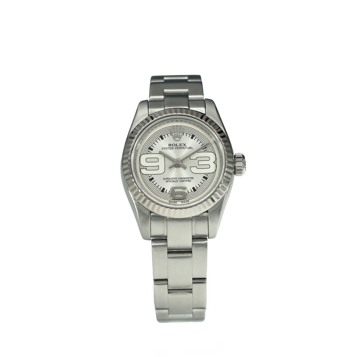 This Rolex Lady Oyster Perpetual 176234 has a silver quarter arabic dial and a bracelet strap. This Rolex has undergone a thorough inspection of water resistance, accuracy, functionality and condition to determine the level of reconditioning required to meet our strict standards. It has also been referenced against technical documents and manufacturer records where available to ensure authenticity and a clean history. All our watches have a 24-month warranty for your peace of mind. One of our skilled polishing technicians has removed marks on the case and bracelet of this watch, brought about by daily wear and tear, which is why this watch does not come with the remaining manufacturer’s warranty.