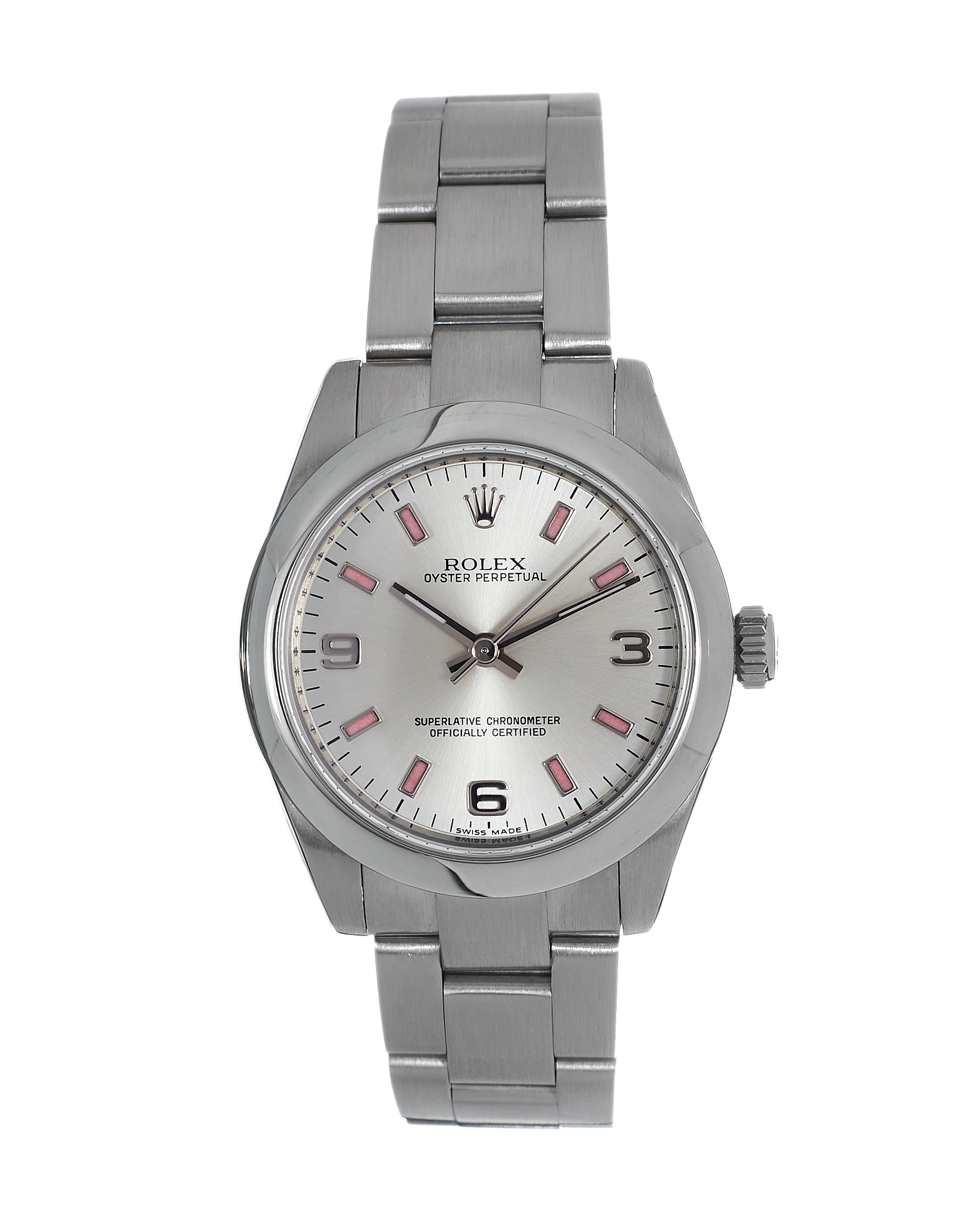 This Rolex Lady Oyster Perpetual 177200 has a silver quarter arabic dial and a bracelet strap. This Rolex has undergone a thorough inspection of water resistance, accuracy, functionality and condition to determine the level of reconditioning required to meet our strict standards. It has also been referenced against technical documents and manufacturer records where available to ensure authenticity and a clean history. All our watches have a 24-month warranty for your peace of mind. One of our skilled polishing technicians has removed marks on the case and bracelet of this watch, brought about by daily wear and tear, which is why this watch does not come with the remaining manufacturer’s warranty.