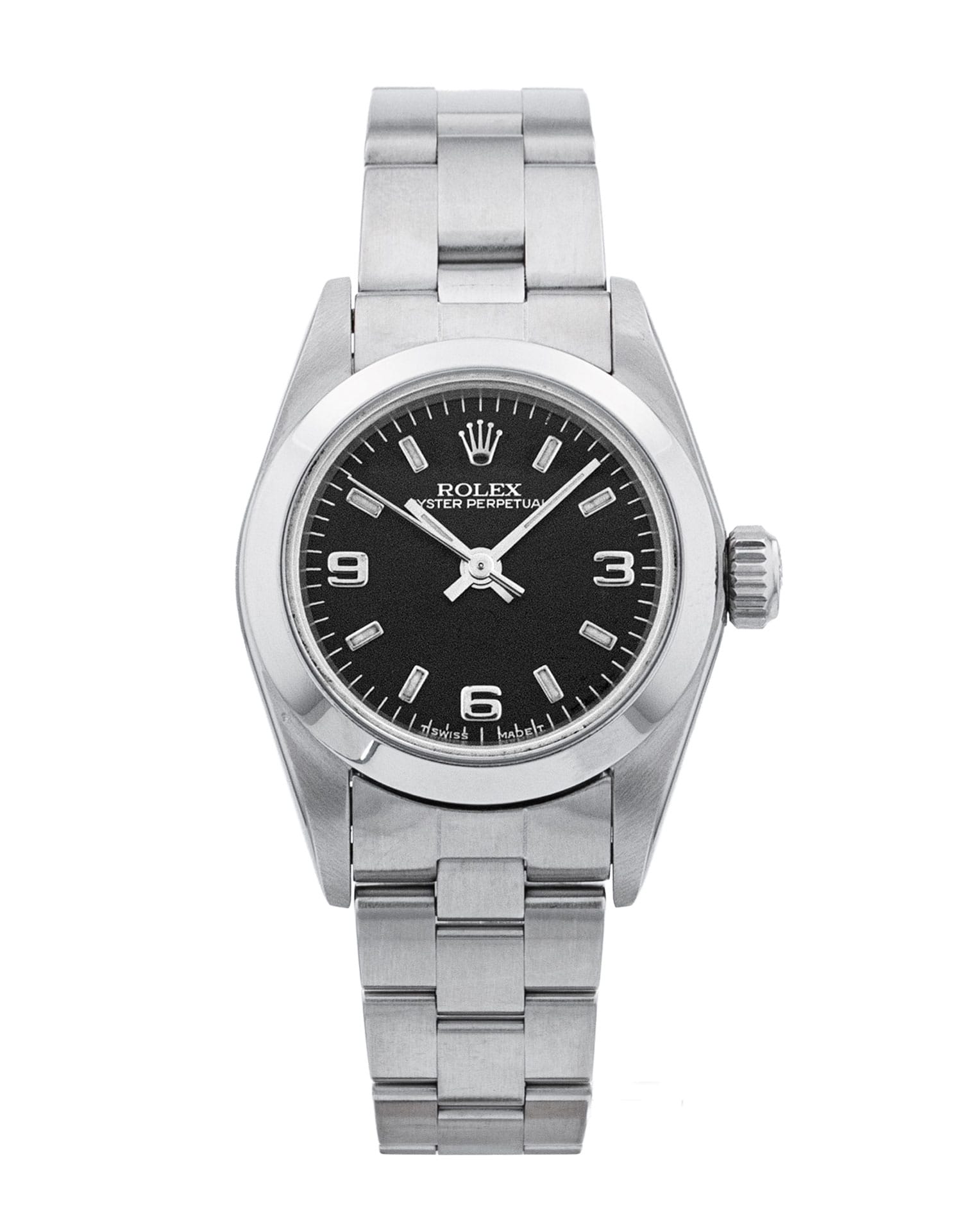 This Rolex Lady Oyster Perpetual 67180 has a black quarter arabic dial and a bracelet strap. This Rolex has undergone a thorough inspection of water resistance, accuracy, functionality and condition to determine the level of reconditioning required to meet our strict standards. It has also been referenced against technical documents and manufacturer records where available to ensure authenticity and a clean history. All our watches have a 24-month warranty for your peace of mind. One of our skilled polishing technicians has removed marks on the case and bracelet of this watch, brought about by daily wear and tear, which is why this watch does not come with the remaining manufacturer’s warranty.