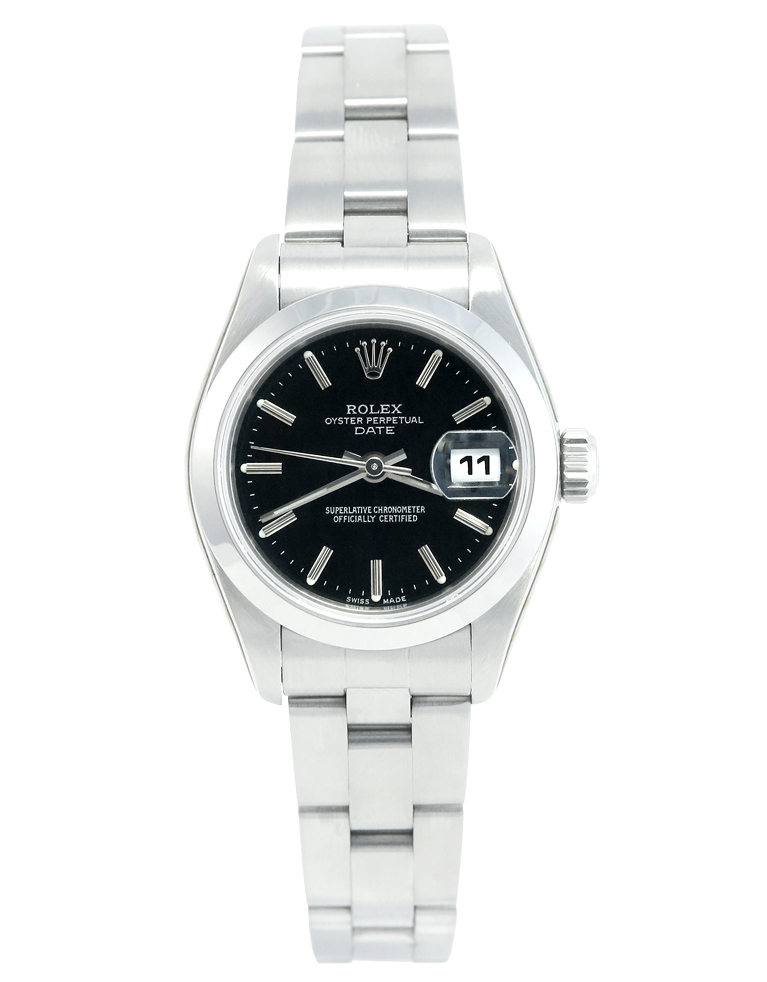 This Rolex Lady Oyster Perpetual 79240 has a black baton dial and a bracelet strap. This Rolex has undergone a thorough inspection of water resistance, accuracy, functionality and condition to determine the level of reconditioning required to meet our strict standards. It has also been referenced against technical documents and manufacturer records where available to ensure authenticity and a clean history. All our watches have a 24-month warranty for your peace of mind. One of our skilled polishing technicians has removed marks on the case and bracelet of this watch, brought about by daily wear and tear, which is why this watch does not come with the remaining manufacturer’s warranty.