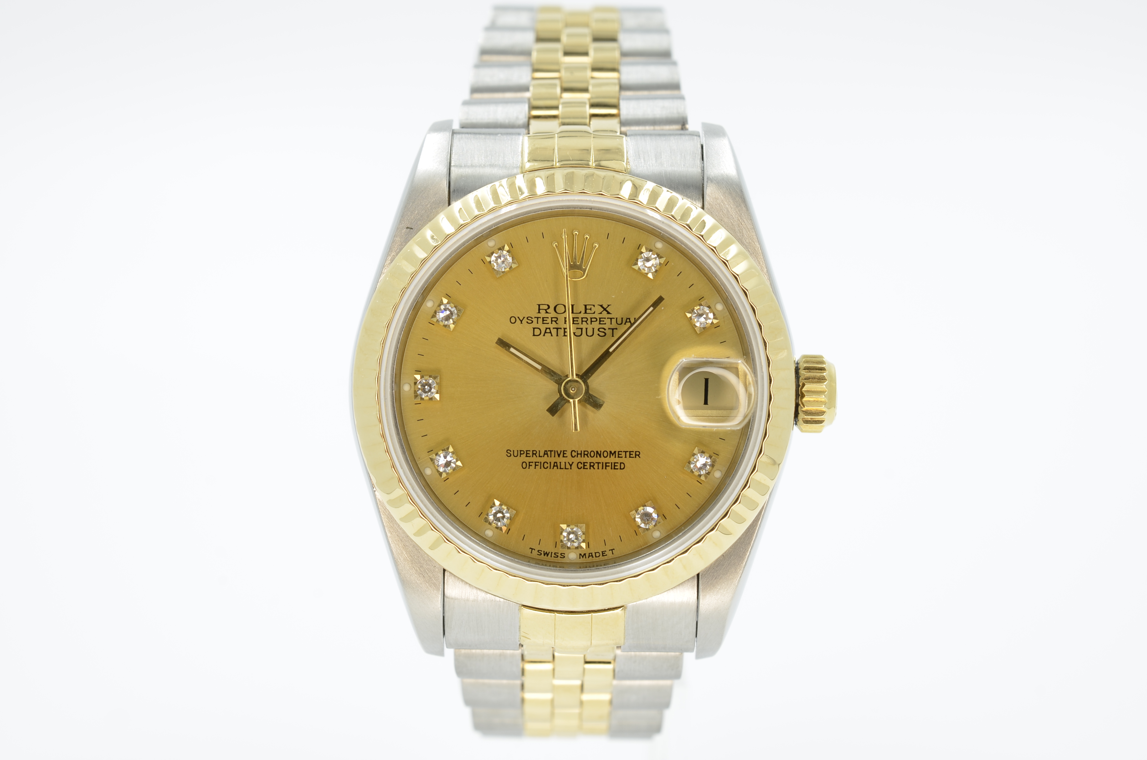 This Rolex Mid-Size Datejust 68273 has a champagne diamond dial and a bracelet strap. This Rolex has undergone a thorough inspection of water resistance, accuracy, functionality and condition to determine the level of reconditioning required to meet our strict standards. It has also been referenced against technical documents and manufacturer records where available to ensure authenticity and a clean history. All our watches have a 24-month warranty for your peace of mind. One of our skilled polishing technicians has removed marks on the case and bracelet of this watch, brought about by daily wear and tear, which is why this watch does not come with the remaining manufacturer’s warranty.