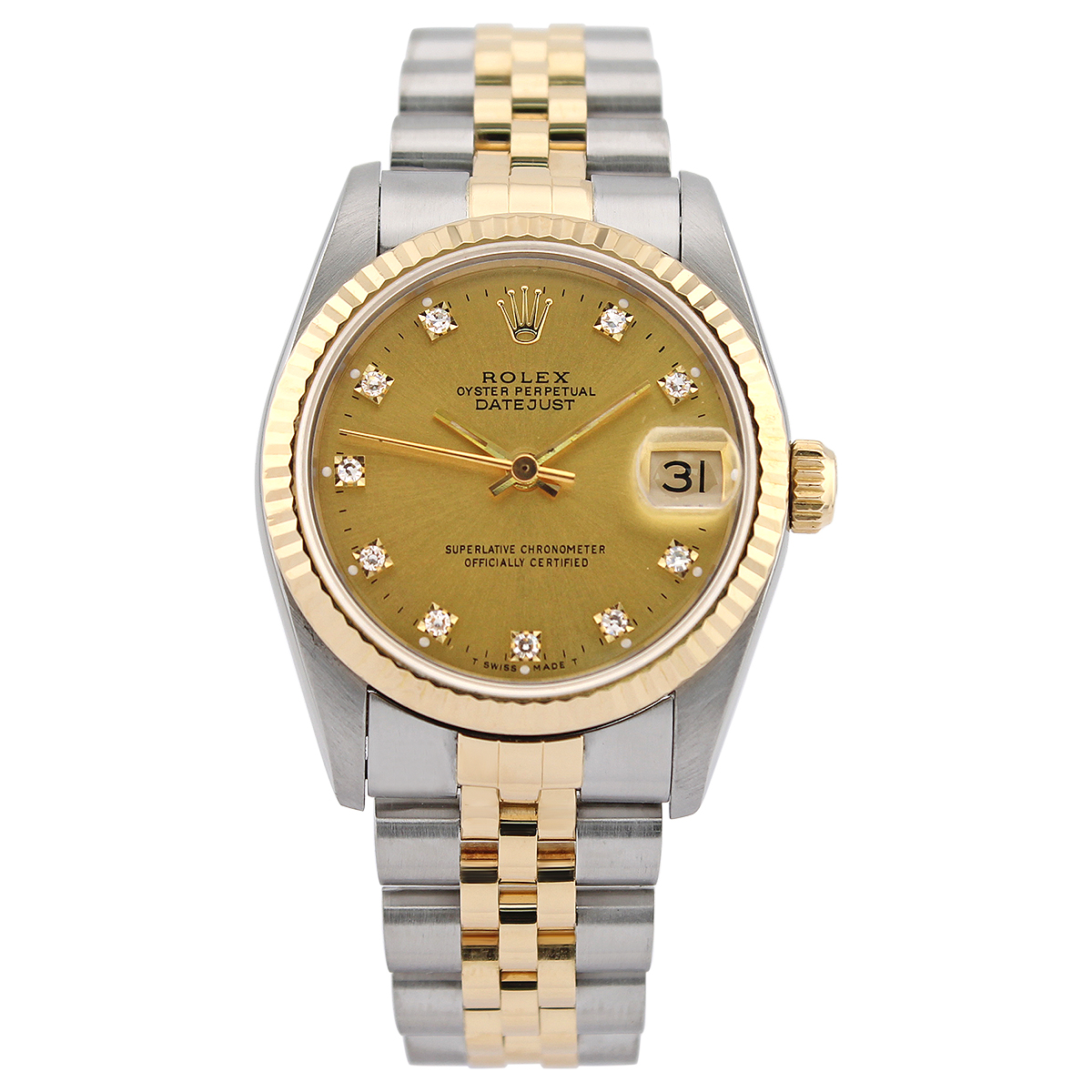 This Rolex Mid-Size Datejust 68273 has a champagne diamond dial and a bracelet strap. This Rolex has undergone a thorough inspection of water resistance, accuracy, functionality and condition to determine the level of reconditioning required to meet our strict standards. It has also been referenced against technical documents and manufacturer records where available to ensure authenticity and a clean history. All our watches have a 24-month warranty for your peace of mind. One of our skilled polishing technicians has removed marks on the case and bracelet of this watch, brought about by daily wear and tear, which is why this watch does not come with the remaining manufacturer’s warranty.