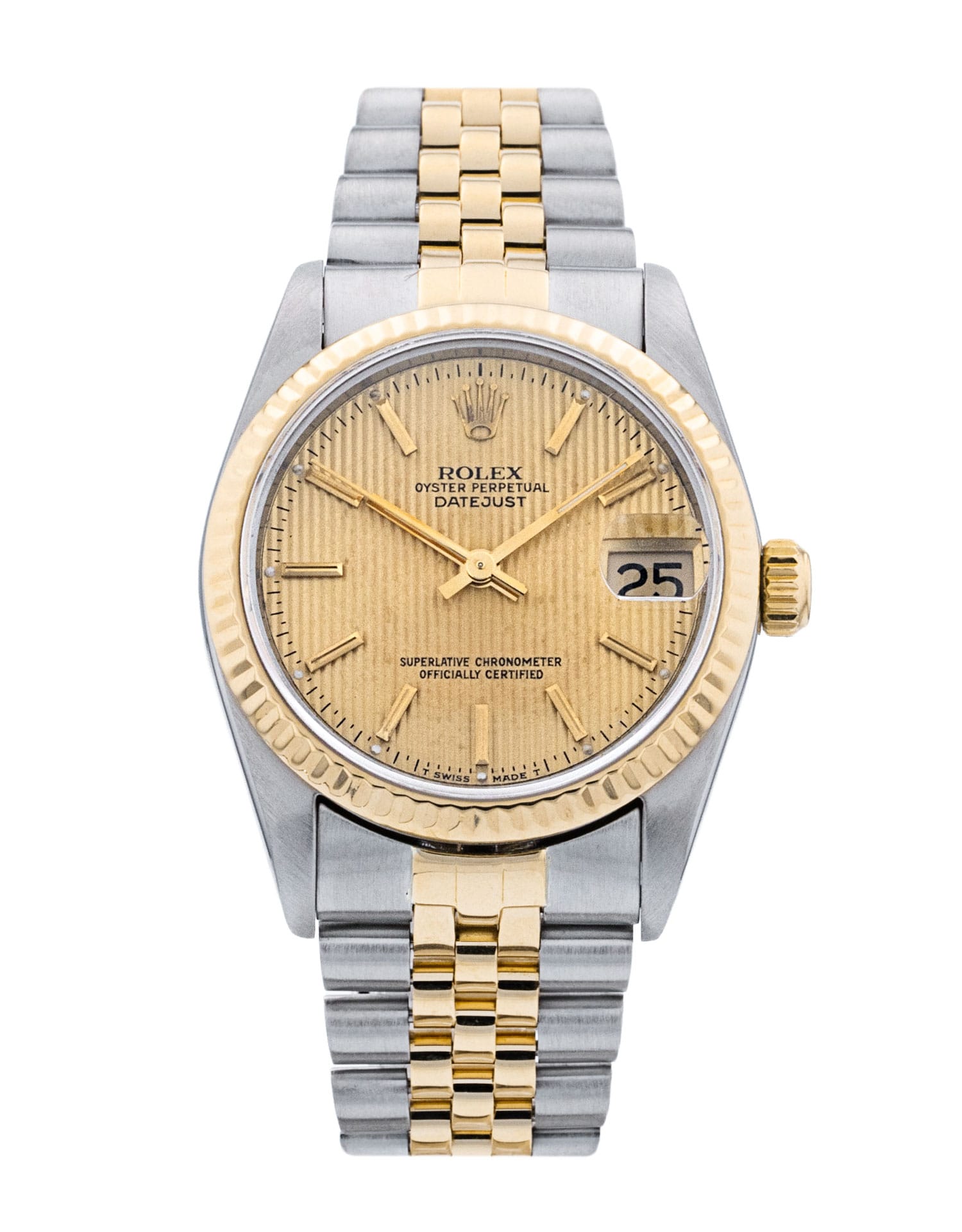 This Rolex Mid-Size Datejust 68273 has a champagne tapestry baton dial and a bracelet strap. This Rolex has undergone a thorough inspection of water resistance, accuracy, functionality and condition to determine the level of reconditioning required to meet our strict standards. It has also been referenced against technical documents and manufacturer records where available to ensure authenticity and a clean history. All our watches have a 24-month warranty for your peace of mind. One of our skilled polishing technicians has removed marks on the case and bracelet of this watch, brought about by daily wear and tear, which is why this watch does not come with the remaining manufacturer’s warranty.