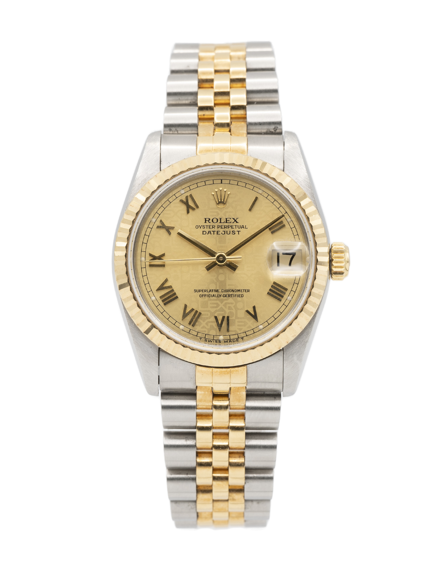 This Rolex Mid-Size Datejust 68273 has a champagne jubilee roman numeral dial and a bracelet strap. This Rolex has undergone a thorough inspection of water resistance, accuracy, functionality and condition to determine the level of reconditioning required to meet our strict standards. It has also been referenced against technical documents and manufacturer records where available to ensure authenticity and a clean history. All our watches have a 24-month warranty for your peace of mind. One of our skilled polishing technicians has removed marks on the case and bracelet of this watch, brought about by daily wear and tear, which is why this watch does not come with the remaining manufacturer’s warranty.