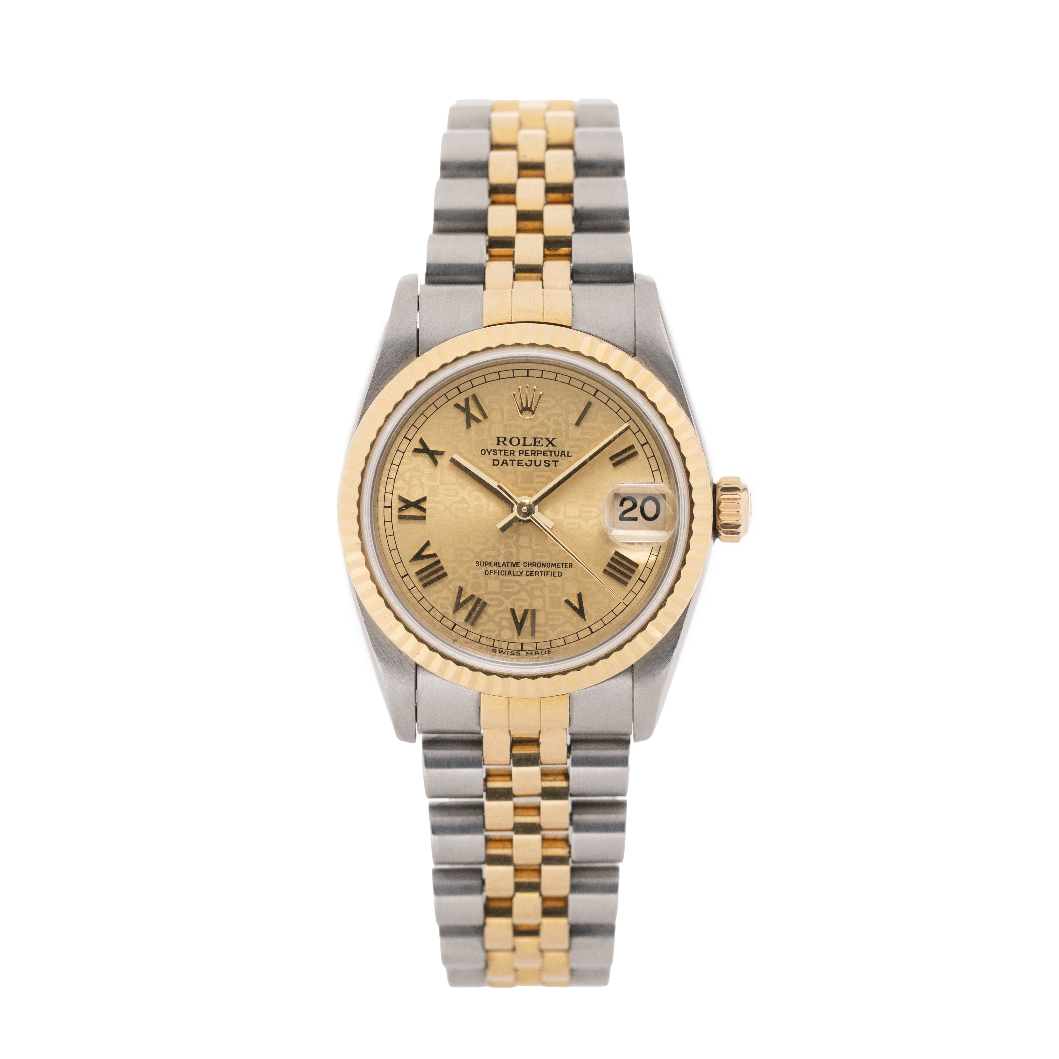 This Rolex Mid-Size Datejust 78273 has a champagne roman numeral dial and a bracelet strap. This Rolex has undergone a thorough inspection of water resistance, accuracy, functionality and condition to determine the level of reconditioning required to meet our strict standards. It has also been referenced against technical documents and manufacturer records where available to ensure authenticity and a clean history. All our watches have a 24-month warranty for your peace of mind. One of our skilled polishing technicians has removed marks on the case and bracelet of this watch, brought about by daily wear and tear, which is why this watch does not come with the remaining manufacturer’s warranty.