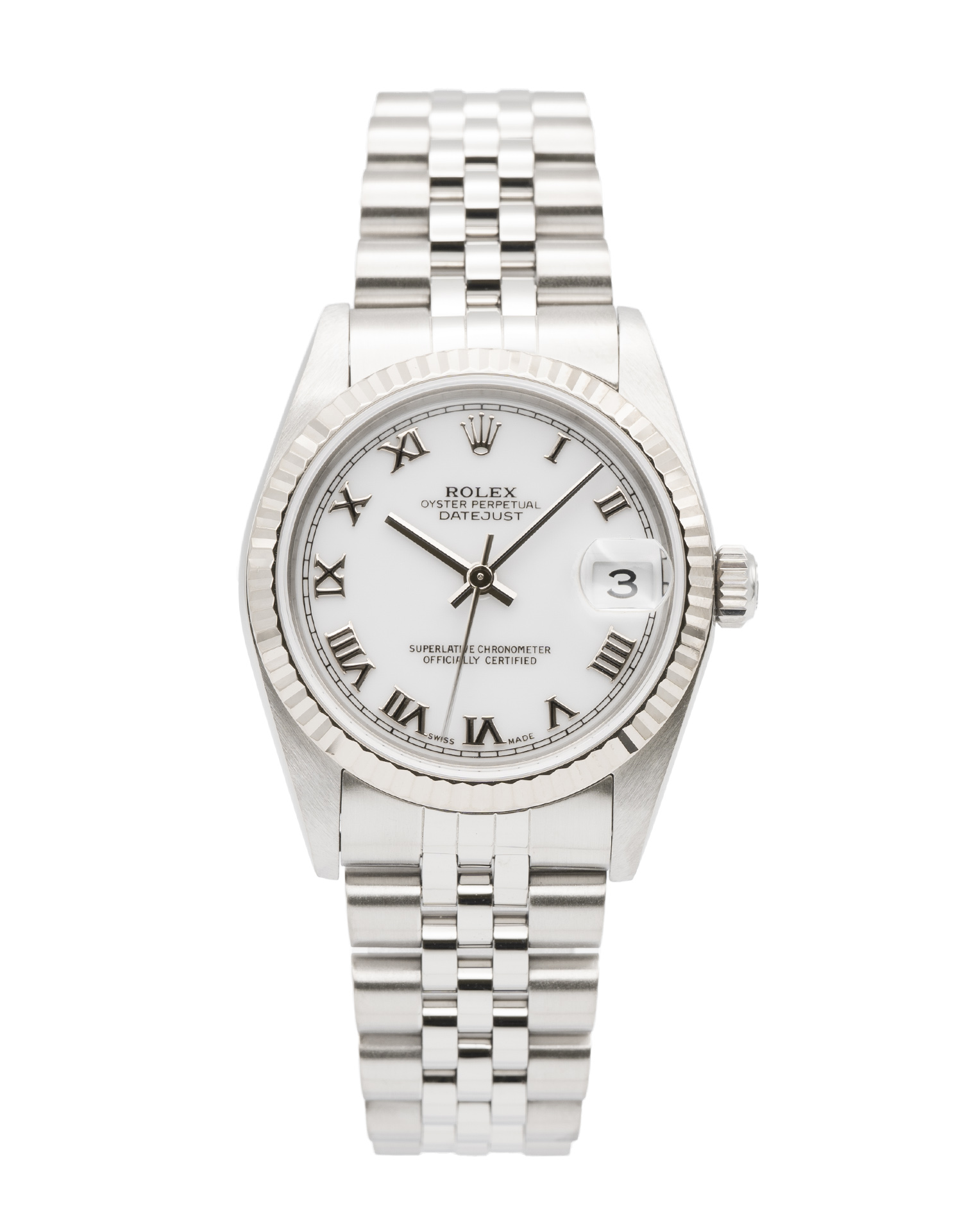 This Rolex Mid-Size Datejust 78274 has a white roman numeral dial and a bracelet strap. This Rolex has undergone a thorough inspection of water resistance, accuracy, functionality and condition to determine the level of reconditioning required to meet our strict standards. It has also been referenced against technical documents and manufacturer records where available to ensure authenticity and a clean history. All our watches have a 24-month warranty for your peace of mind. One of our skilled polishing technicians has removed marks on the case and bracelet of this watch, brought about by daily wear and tear, which is why this watch does not come with the remaining manufacturer’s warranty.
