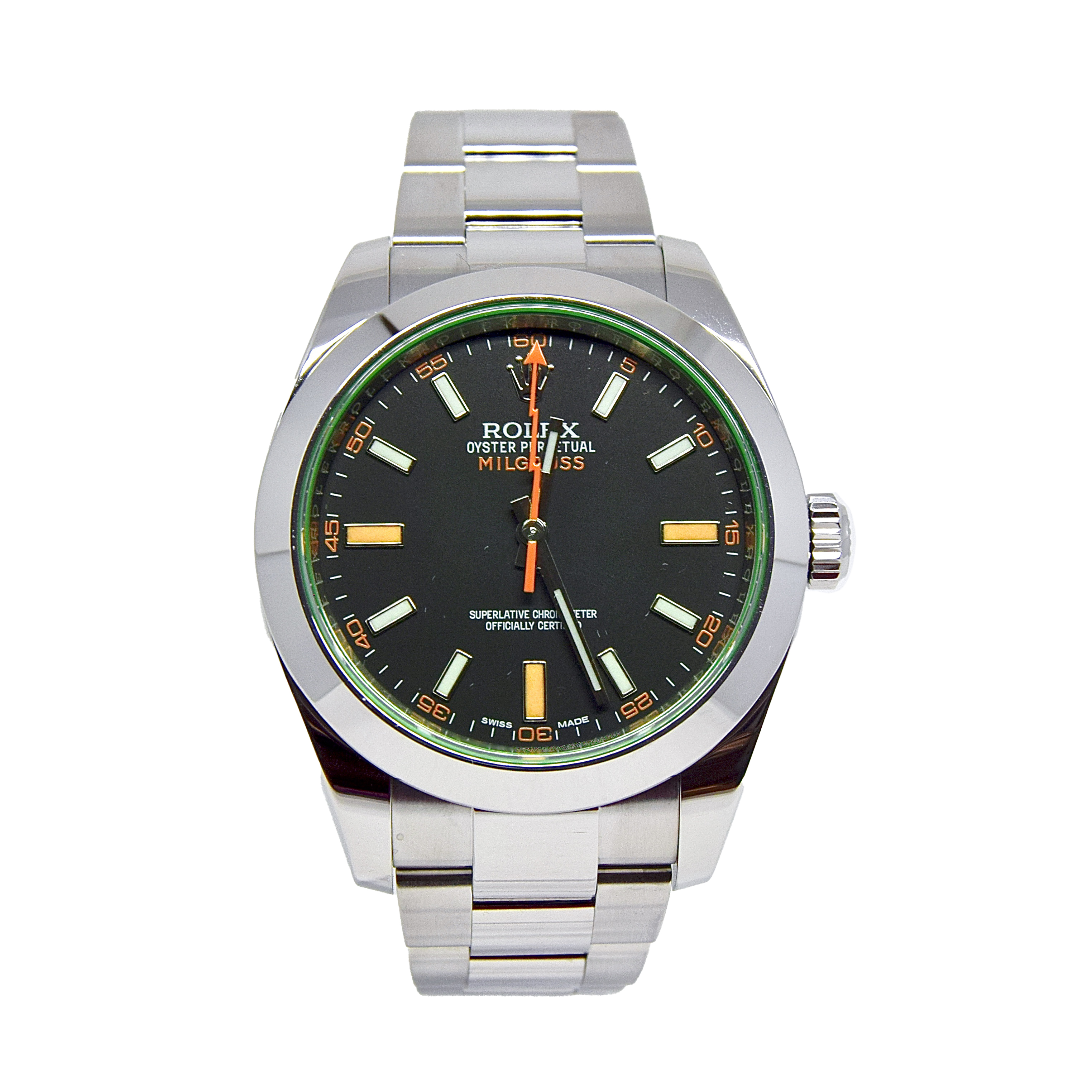 This Rolex Milgauss 116400 GV has a black baton dial and a bracelet strap. This Rolex has undergone a thorough inspection of water resistance, accuracy, functionality and condition to determine the level of reconditioning required to meet our strict standards. It has also been referenced against technical documents and manufacturer records where available to ensure authenticity and a clean history. All our watches have a 24-month warranty for your peace of mind. One of our skilled polishing technicians has removed marks on the case and bracelet of this watch, brought about by daily wear and tear, which is why this watch does not come with the remaining manufacturer’s warranty.