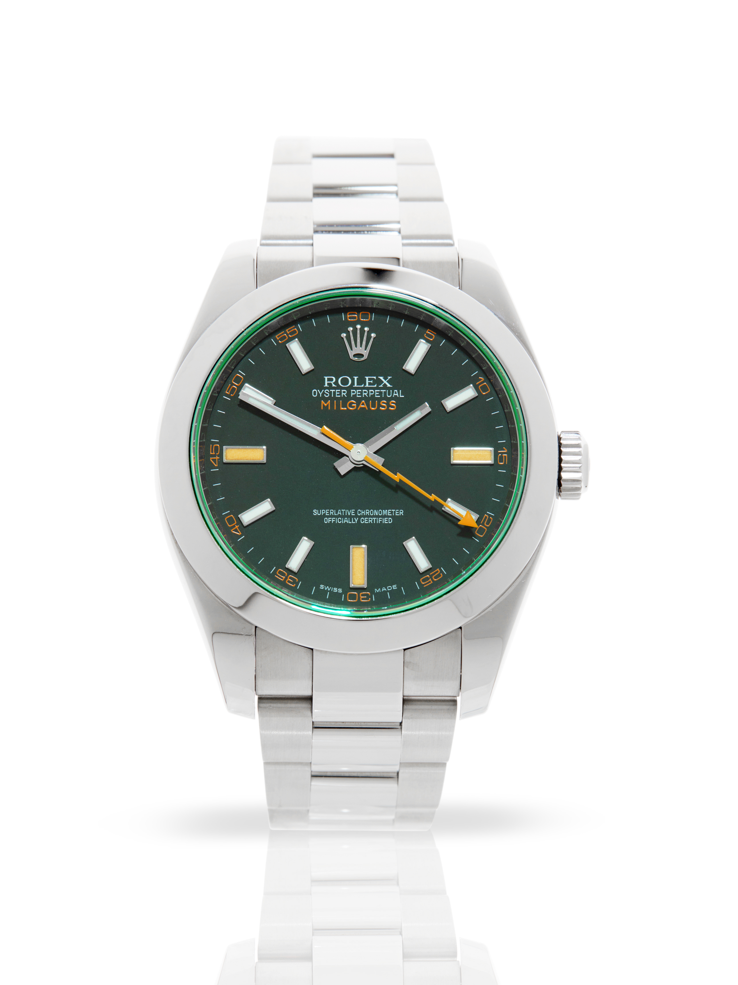 This Rolex Milgauss 116400 GV has a black baton dial and a bracelet strap. This Rolex has undergone a thorough inspection of water resistance, accuracy, functionality and condition to determine the level of reconditioning required to meet our strict standards. It has also been referenced against technical documents and manufacturer records where available to ensure authenticity and a clean history. All our watches have a 24-month warranty for your peace of mind. One of our skilled polishing technicians has removed marks on the case and bracelet of this watch, brought about by daily wear and tear, which is why this watch does not come with the remaining manufacturer’s warranty.