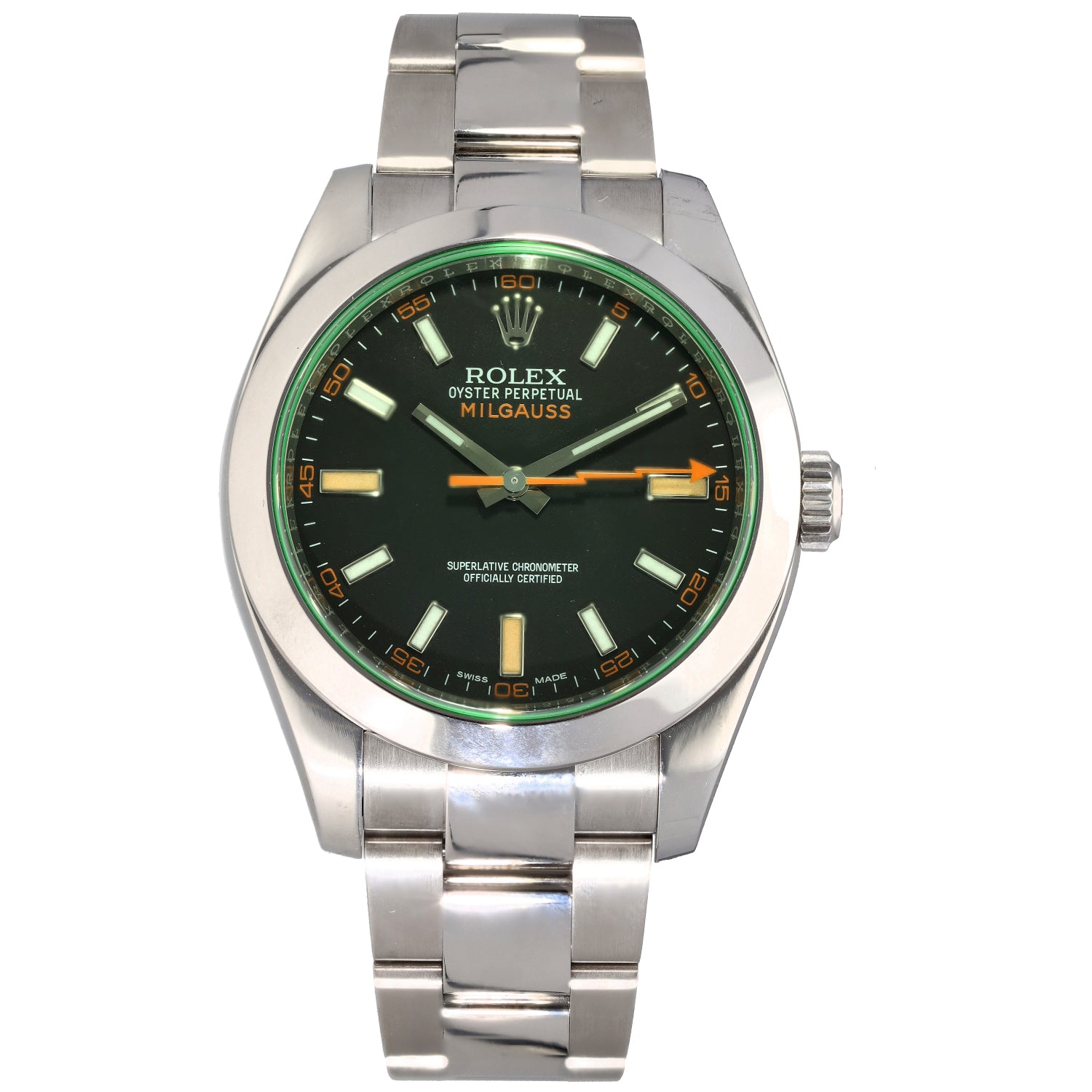 This Rolex Milgauss 116400 has a black baton dial and a bracelet strap. This Rolex has undergone a thorough inspection of water resistance, accuracy, functionality and condition to determine the level of reconditioning required to meet our strict standards. It has also been referenced against technical documents and manufacturer records where available to ensure authenticity and a clean history. All our watches have a 24-month warranty for your peace of mind. One of our skilled polishing technicians has removed marks on the case and bracelet of this watch, brought about by daily wear and tear, which is why this watch does not come with the remaining manufacturer’s warranty.