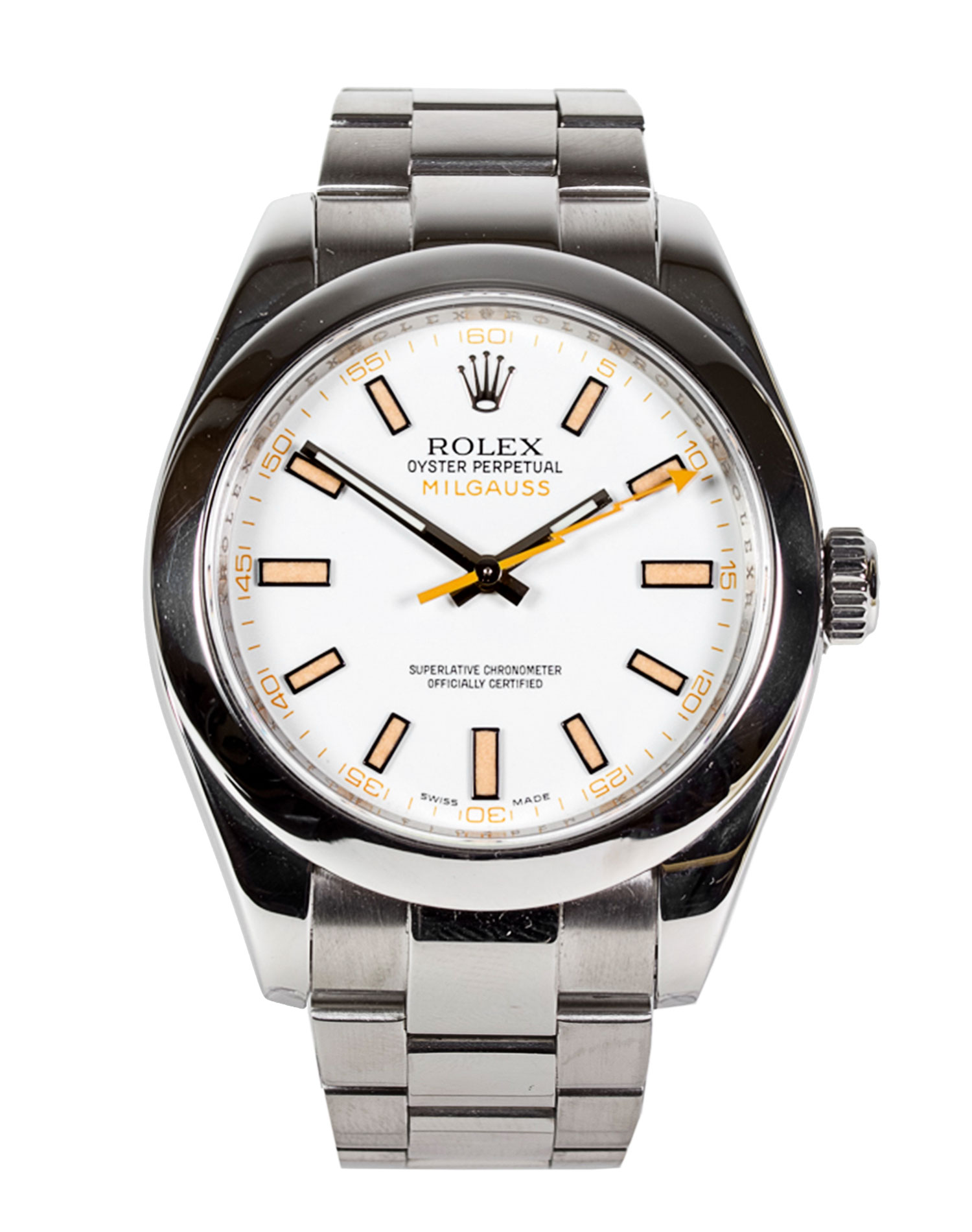 This Rolex Milgauss 116400 has a white baton dial and a bracelet strap. This Rolex has undergone a thorough inspection of water resistance, accuracy, functionality and condition to determine the level of reconditioning required to meet our strict standards. It has also been referenced against technical documents and manufacturer records where available to ensure authenticity and a clean history. All our watches have a 24-month warranty for your peace of mind. One of our skilled polishing technicians has removed marks on the case and bracelet of this watch, brought about by daily wear and tear, which is why this watch does not come with the remaining manufacturer’s warranty.