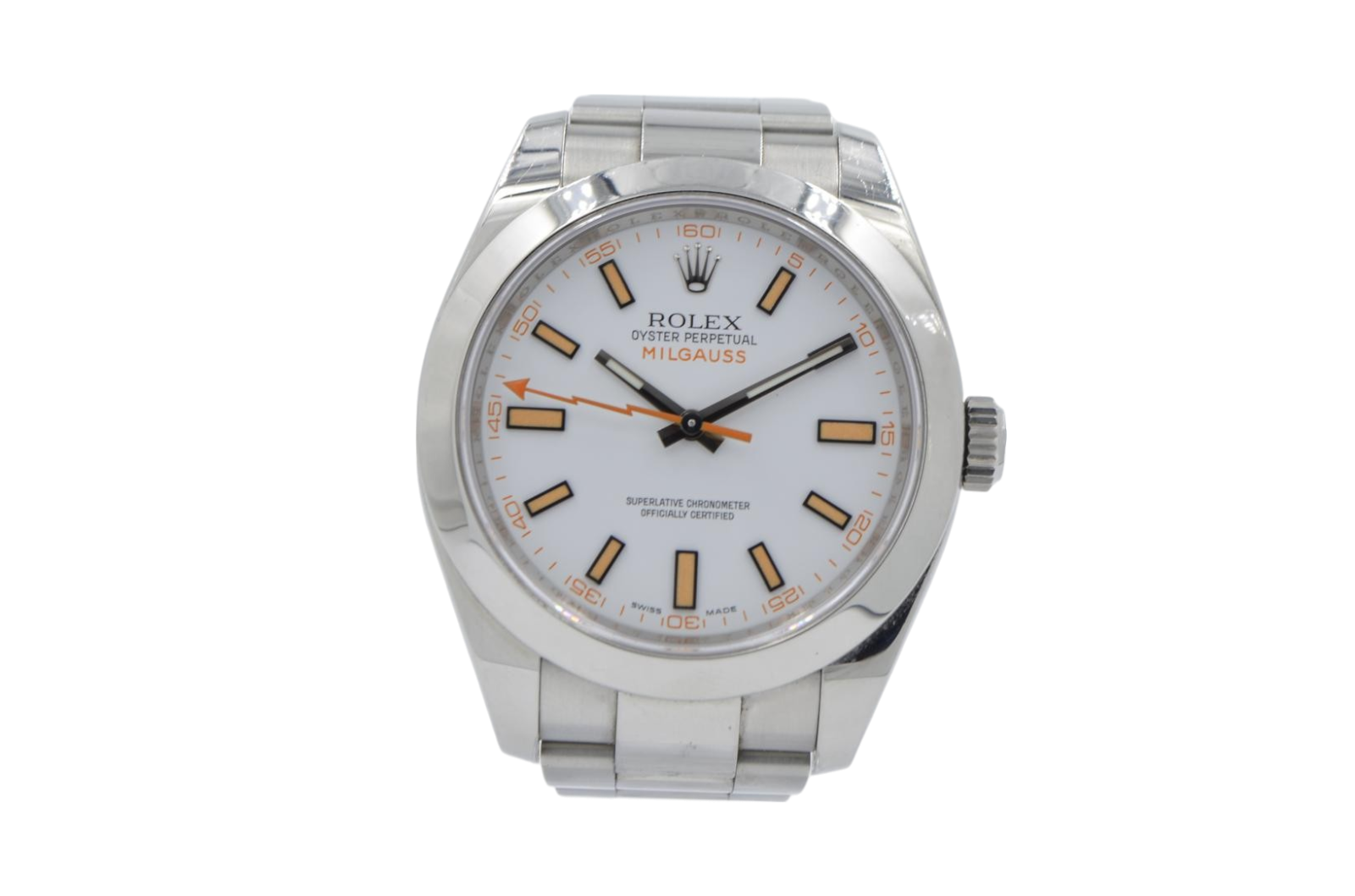This Rolex Milgauss 116400 has a white baton dial and a bracelet strap. This Rolex has undergone a thorough inspection of water resistance, accuracy, functionality and condition to determine the level of reconditioning required to meet our strict standards. It has also been referenced against technical documents and manufacturer records where available to ensure authenticity and a clean history. All our watches have a 24-month warranty for your peace of mind. One of our skilled polishing technicians has removed marks on the case and bracelet of this watch, brought about by daily wear and tear, which is why this watch does not come with the remaining manufacturer’s warranty.