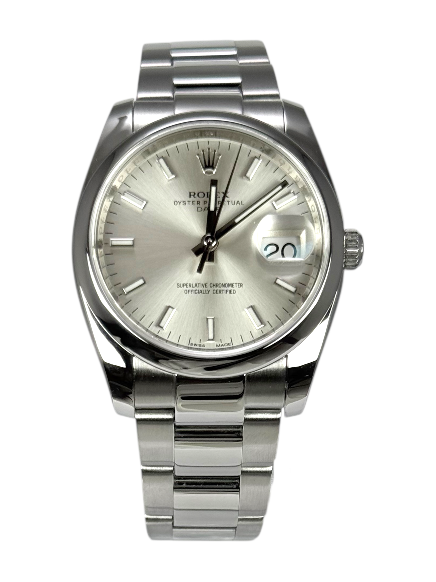 This Rolex Oyster Perpetual Date 115200 has a silver baton dial and a bracelet strap. This Rolex has undergone a thorough inspection of water resistance, accuracy, functionality and condition to determine the level of reconditioning required to meet our strict standards. It has also been referenced against technical documents and manufacturer records where available to ensure authenticity and a clean history. Our watches have a 24-month warranty for your peace of mind, in conjunction with any remaining manufacturer’s warranty from new or from service. To maintain the manufacturer’s warranty on this watch, it has not been polished in our service centre.