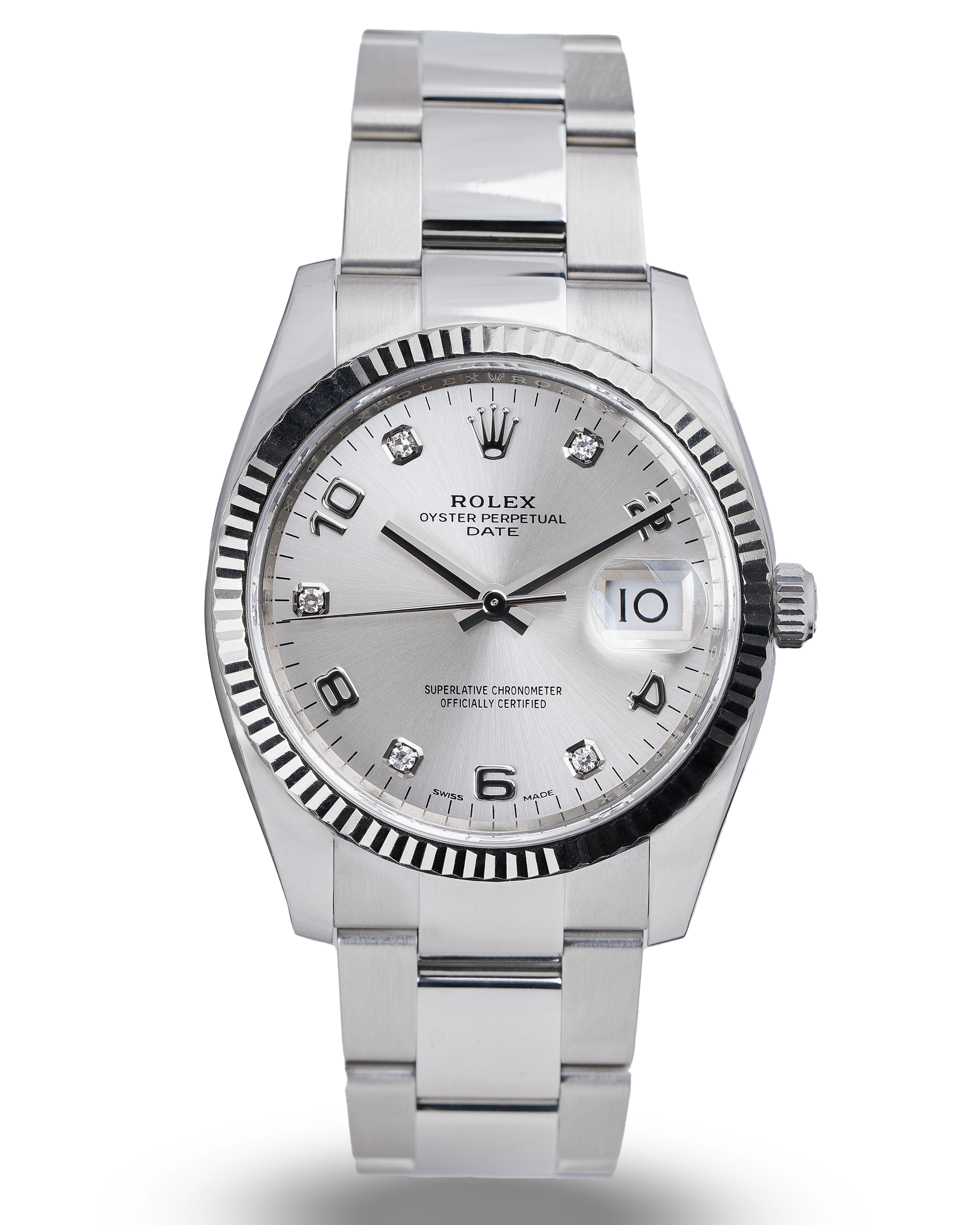 This Rolex Oyster Perpetual Date 115234 has a silver arabic diamond dial and a bracelet strap. This Rolex has undergone a thorough inspection of water resistance, accuracy, functionality and condition to determine the level of reconditioning required to meet our strict standards. It has also been referenced against technical documents and manufacturer records where available to ensure authenticity and a clean history. All our watches have a 24-month warranty for your peace of mind. One of our skilled polishing technicians has removed marks on the case and bracelet of this watch, brought about by daily wear and tear, which is why this watch does not come with the remaining manufacturer’s warranty.
