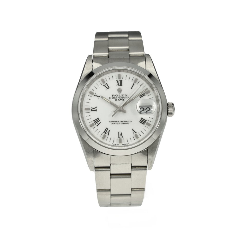 This Rolex Oyster Perpetual Date 15200 has a white roman numeral dial and a bracelet strap. This Rolex has undergone a thorough inspection of water resistance, accuracy, functionality and condition to determine the level of reconditioning required to meet our strict standards. It has also been referenced against technical documents and manufacturer records where available to ensure authenticity and a clean history. All our watches have a 24-month warranty for your peace of mind. One of our skilled polishing technicians has removed marks on the case and bracelet of this watch, brought about by daily wear and tear, which is why this watch does not come with the remaining manufacturer’s warranty.