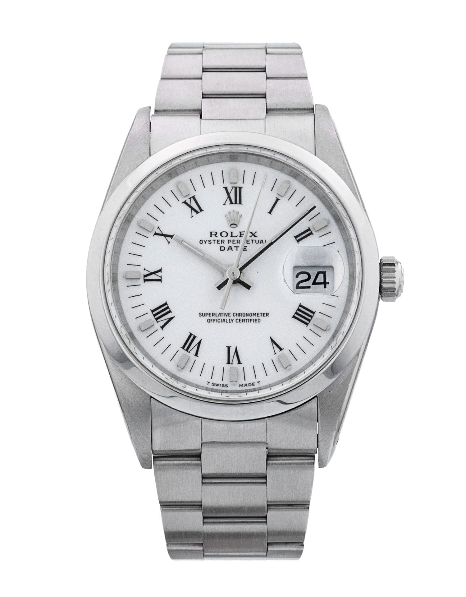 This Rolex Oyster Perpetual Date 15200 has a silver roman numeral dial and a bracelet strap. This Rolex has undergone a thorough inspection of water resistance, accuracy, functionality and condition to determine the level of reconditioning required to meet our strict standards. It has also been referenced against technical documents and manufacturer records where available to ensure authenticity and a clean history. All our watches have a 24-month warranty for your peace of mind. One of our skilled polishing technicians has removed marks on the case and bracelet of this watch, brought about by daily wear and tear, which is why this watch does not come with the remaining manufacturer’s warranty.