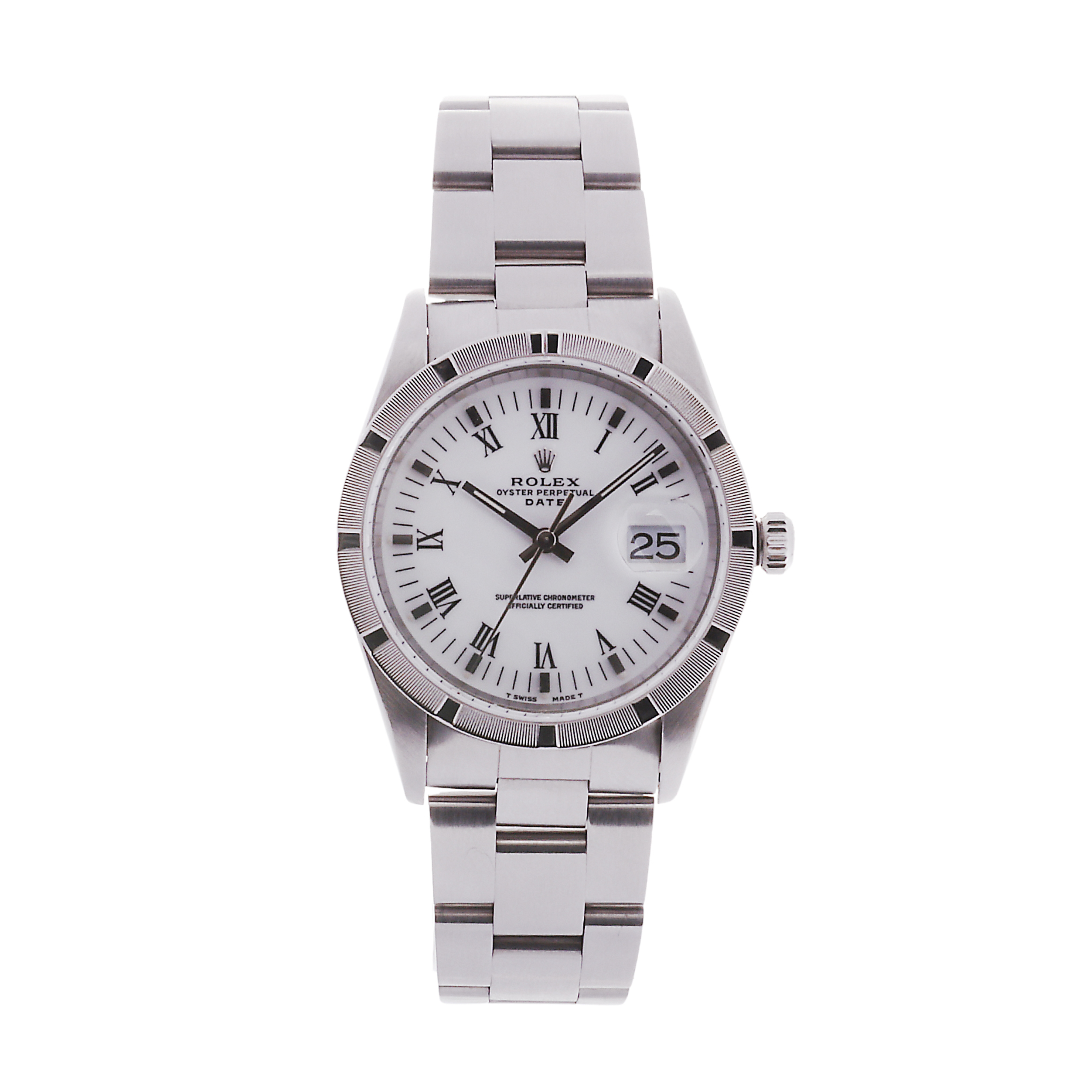 This Rolex Oyster Perpetual Date 15210 has a white roman numeral dial and a bracelet strap. This Rolex has undergone a thorough inspection of water resistance, accuracy, functionality and condition to determine the level of reconditioning required to meet our strict standards. It has also been referenced against technical documents and manufacturer records where available to ensure authenticity and a clean history. All our watches have a 24-month warranty for your peace of mind. One of our skilled polishing technicians has removed marks on the case and bracelet of this watch, brought about by daily wear and tear, which is why this watch does not come with the remaining manufacturer’s warranty.