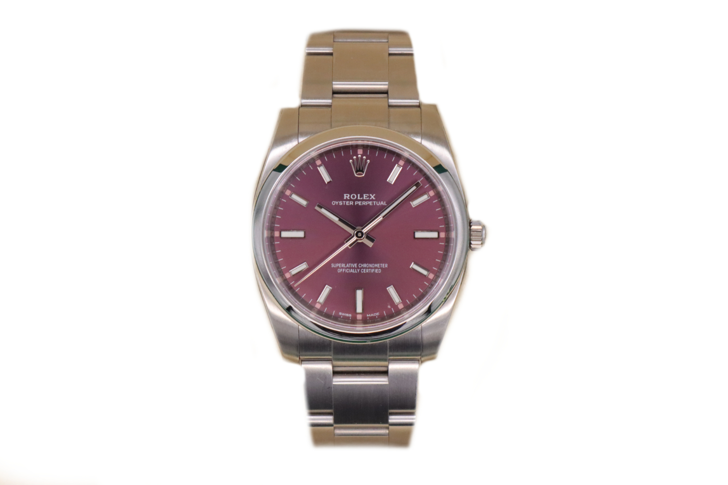 This Rolex Oyster Perpetual 114200 has a white baton dial and a bracelet strap. This Rolex has undergone a thorough inspection of water resistance, accuracy, functionality and condition to determine the level of reconditioning required to meet our strict standards. It has also been referenced against technical documents and manufacturer records where available to ensure authenticity and a clean history. All our watches have a 24-month warranty for your peace of mind. One of our skilled polishing technicians has removed marks on the case and bracelet of this watch, brought about by daily wear and tear, which is why this watch does not come with the remaining manufacturer’s warranty.