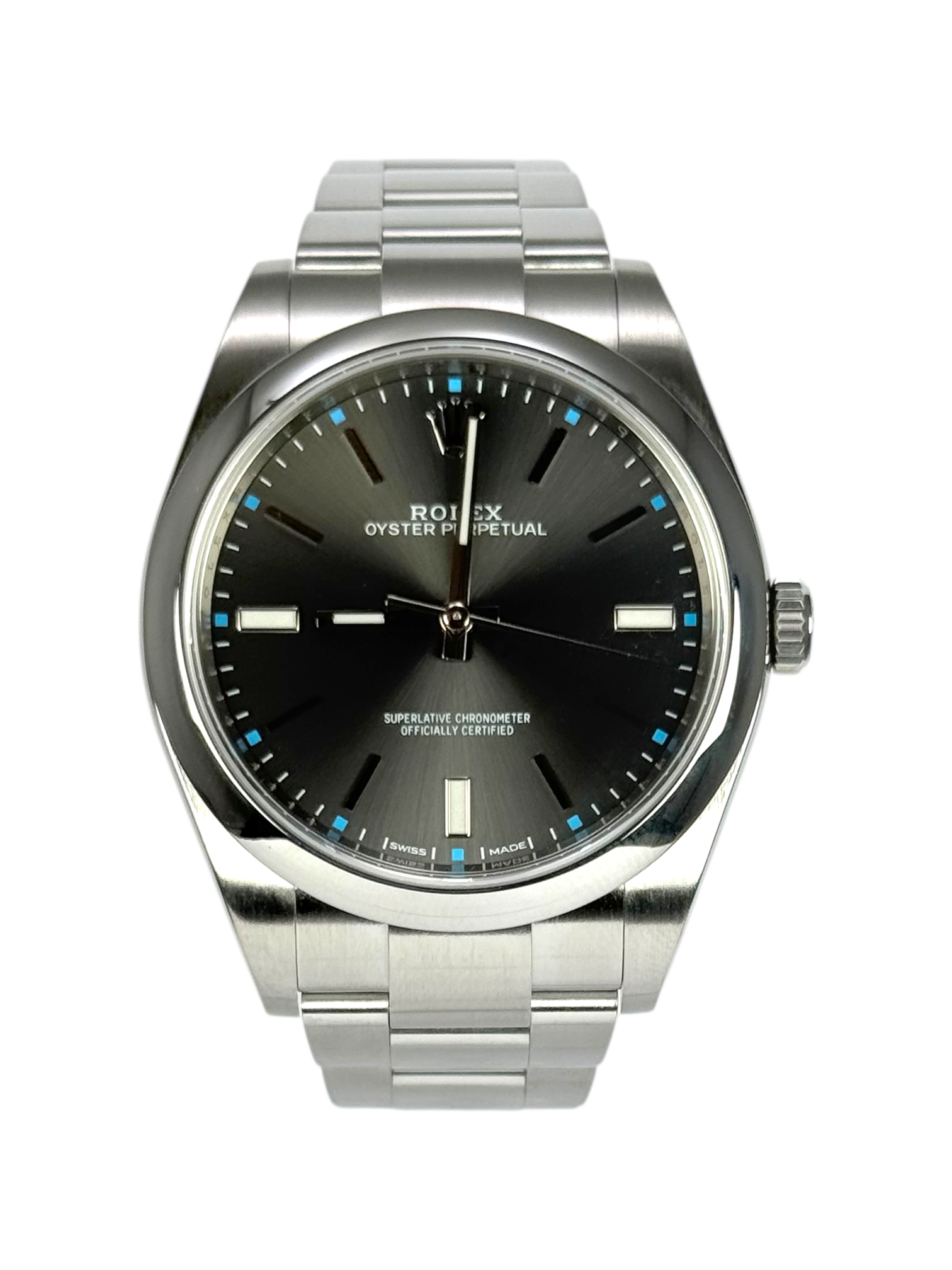 This Rolex Oyster Perpetual 114300 has a rhodium baton dial and a bracelet strap. This Rolex has undergone a thorough inspection of water resistance, accuracy, functionality and condition to determine the level of reconditioning required to meet our strict standards. It has also been referenced against technical documents and manufacturer records where available to ensure authenticity and a clean history. All our watches have a 24-month warranty for your peace of mind. One of our skilled polishing technicians has removed marks on the case and bracelet of this watch, brought about by daily wear and tear, which is why this watch does not come with the remaining manufacturer’s warranty.