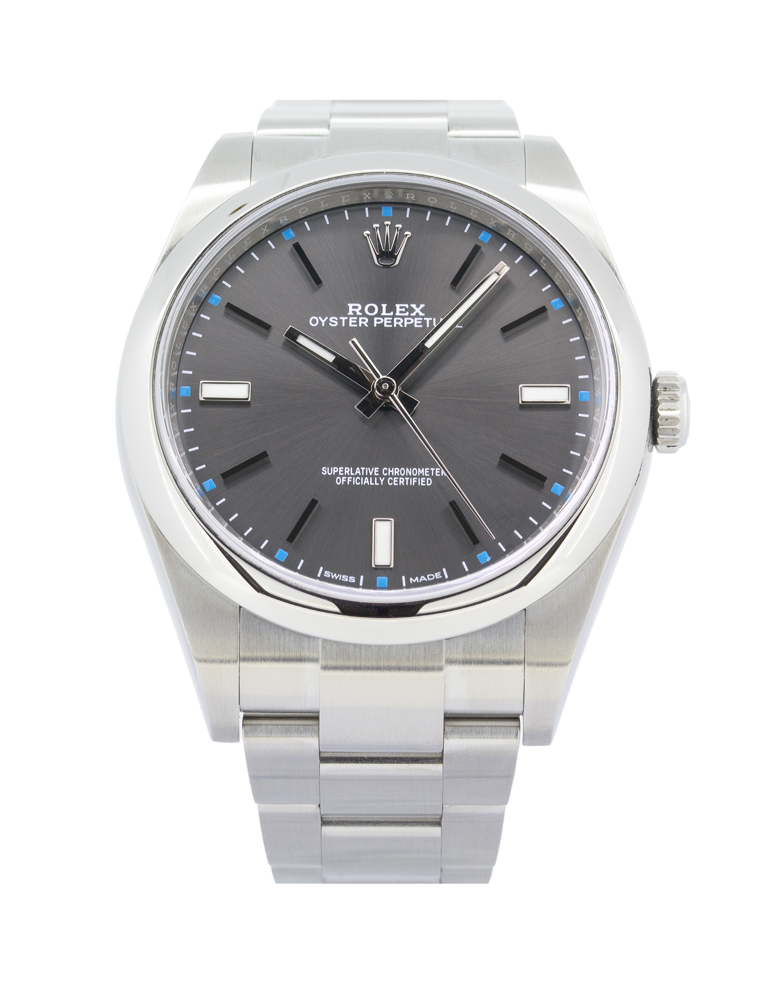 This Rolex Oyster Perpetual 114300 has a rhodium baton dial and a bracelet strap. This Rolex has undergone a thorough inspection of water resistance, accuracy, functionality and condition to determine the level of reconditioning required to meet our strict standards. It has also been referenced against technical documents and manufacturer records where available to ensure authenticity and a clean history. All our watches have a 24-month warranty for your peace of mind. One of our skilled polishing technicians has removed marks on the case and bracelet of this watch, brought about by daily wear and tear, which is why this watch does not come with the remaining manufacturer’s warranty.