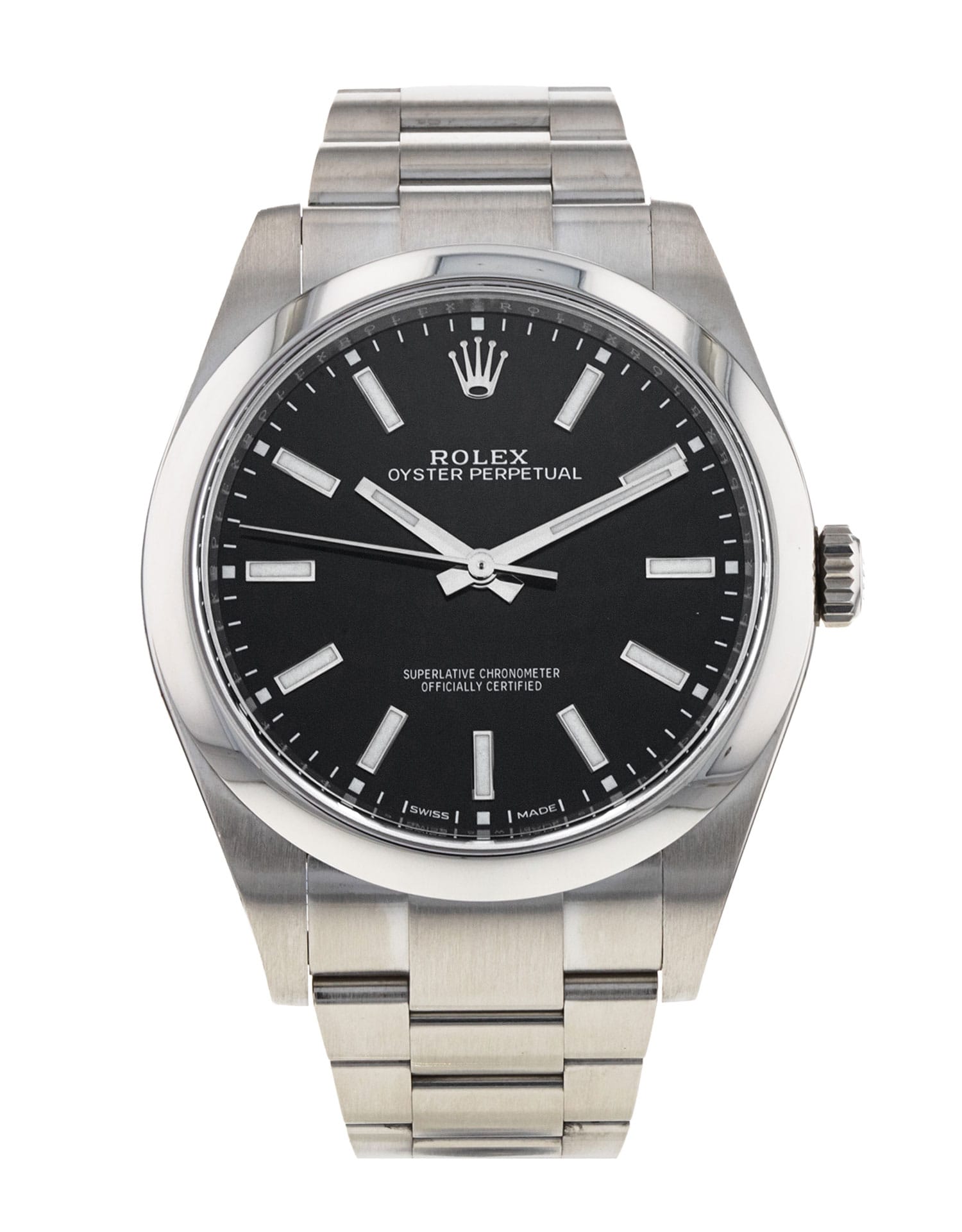 This Rolex Oyster Perpetual 114300 has a black baton dial and a bracelet strap. This Rolex has undergone a thorough inspection of water resistance, accuracy, functionality and condition to determine the level of reconditioning required to meet our strict standards. It has also been referenced against technical documents and manufacturer records where available to ensure authenticity and a clean history. All our watches have a 24-month warranty for your peace of mind. One of our skilled polishing technicians has removed marks on the case and bracelet of this watch, brought about by daily wear and tear, which is why this watch does not come with the remaining manufacturer’s warranty.