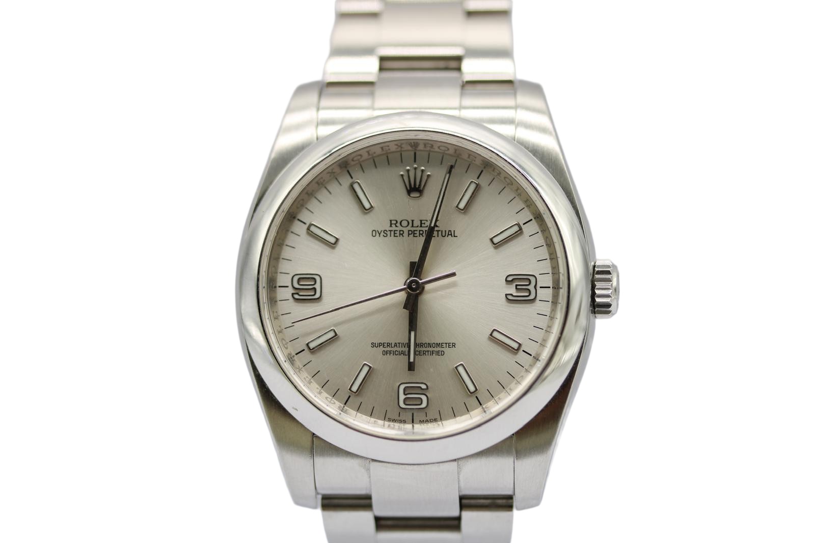 This Rolex Oyster Perpetual 116000 has a silver baton dial and a bracelet strap. This Rolex has undergone a thorough inspection of water resistance, accuracy, functionality and condition to determine the level of reconditioning required to meet our strict standards. It has also been referenced against technical documents and manufacturer records where available to ensure authenticity and a clean history. All our watches have a 24-month warranty for your peace of mind. One of our skilled polishing technicians has removed marks on the case and bracelet of this watch, brought about by daily wear and tear, which is why this watch does not come with the remaining manufacturer’s warranty.