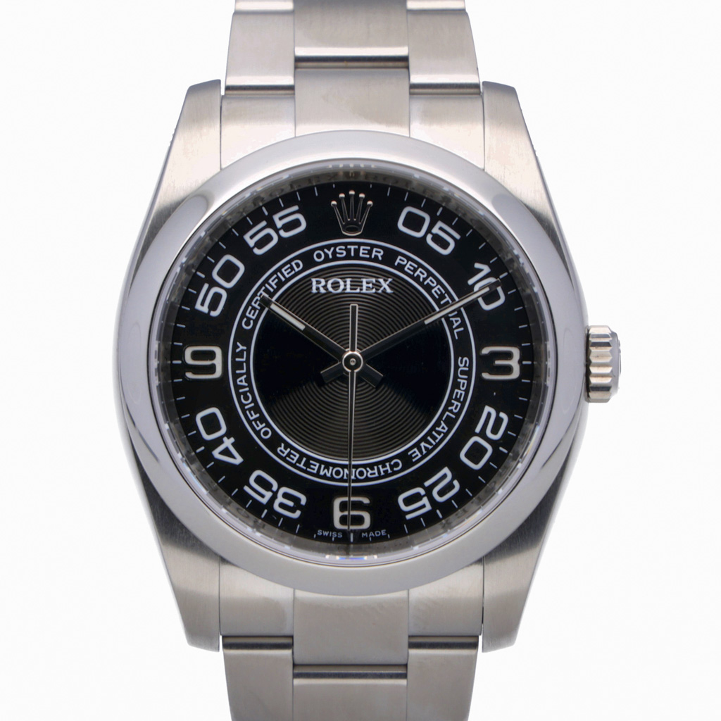 This Rolex Oyster Perpetual 116000 has a black concentric arabic dial and a bracelet strap. This Rolex has undergone a thorough inspection of water resistance, accuracy, functionality and condition to determine the level of reconditioning required to meet our strict standards. It has also been referenced against technical documents and manufacturer records where available to ensure authenticity and a clean history. All our watches have a 24-month warranty for your peace of mind. One of our skilled polishing technicians has removed marks on the case and bracelet of this watch, brought about by daily wear and tear, which is why this watch does not come with the remaining manufacturer’s warranty.