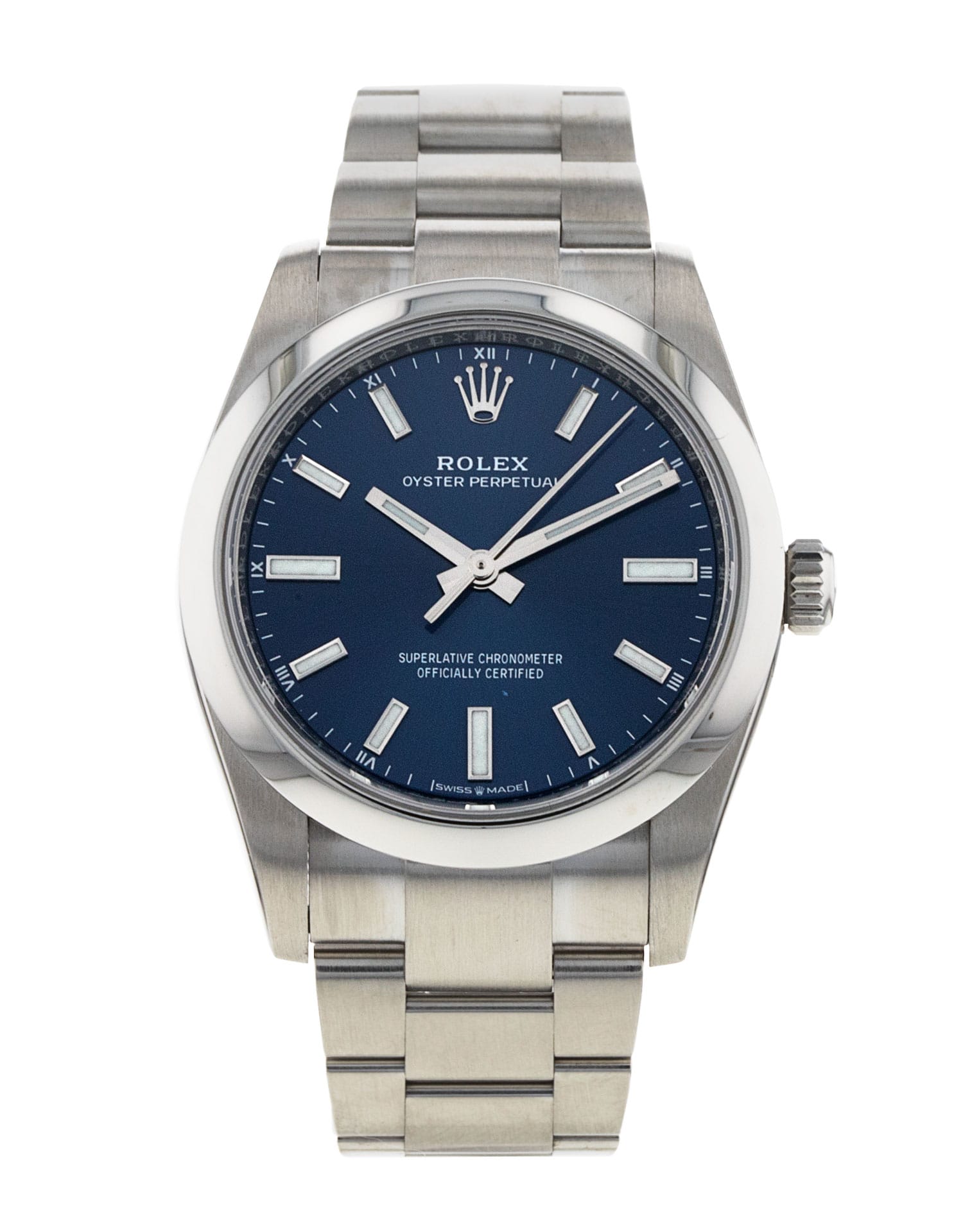 This Rolex Oyster Perpetual 124200 has a blue baton dial and a bracelet strap. This Rolex has undergone a thorough inspection of water resistance, accuracy, functionality and condition to determine the level of reconditioning required to meet our strict standards. It has also been referenced against technical documents and manufacturer records where available to ensure authenticity and a clean history. All our watches have a 24-month warranty for your peace of mind. One of our skilled polishing technicians has removed marks on the case and bracelet of this watch, brought about by daily wear and tear, which is why this watch does not come with the remaining manufacturer’s warranty.