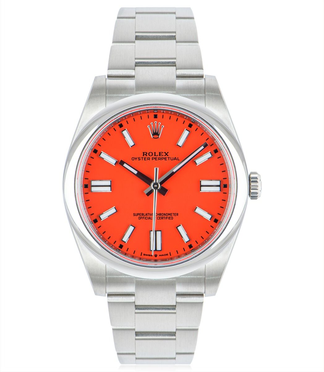 This Rolex Oyster Perpetual 124300 has a coral dial and a bracelet strap. This Rolex has undergone a thorough inspection of water resistance, accuracy, functionality and condition to determine the level of reconditioning required to meet our strict standards. It has also been referenced against technical documents and manufacturer records where available to ensure authenticity and a clean history. All our watches have a 24-month warranty for your peace of mind. One of our skilled polishing technicians has removed marks on the case and bracelet of this watch, brought about by daily wear and tear, which is why this watch does not come with the remaining manufacturer’s warranty.