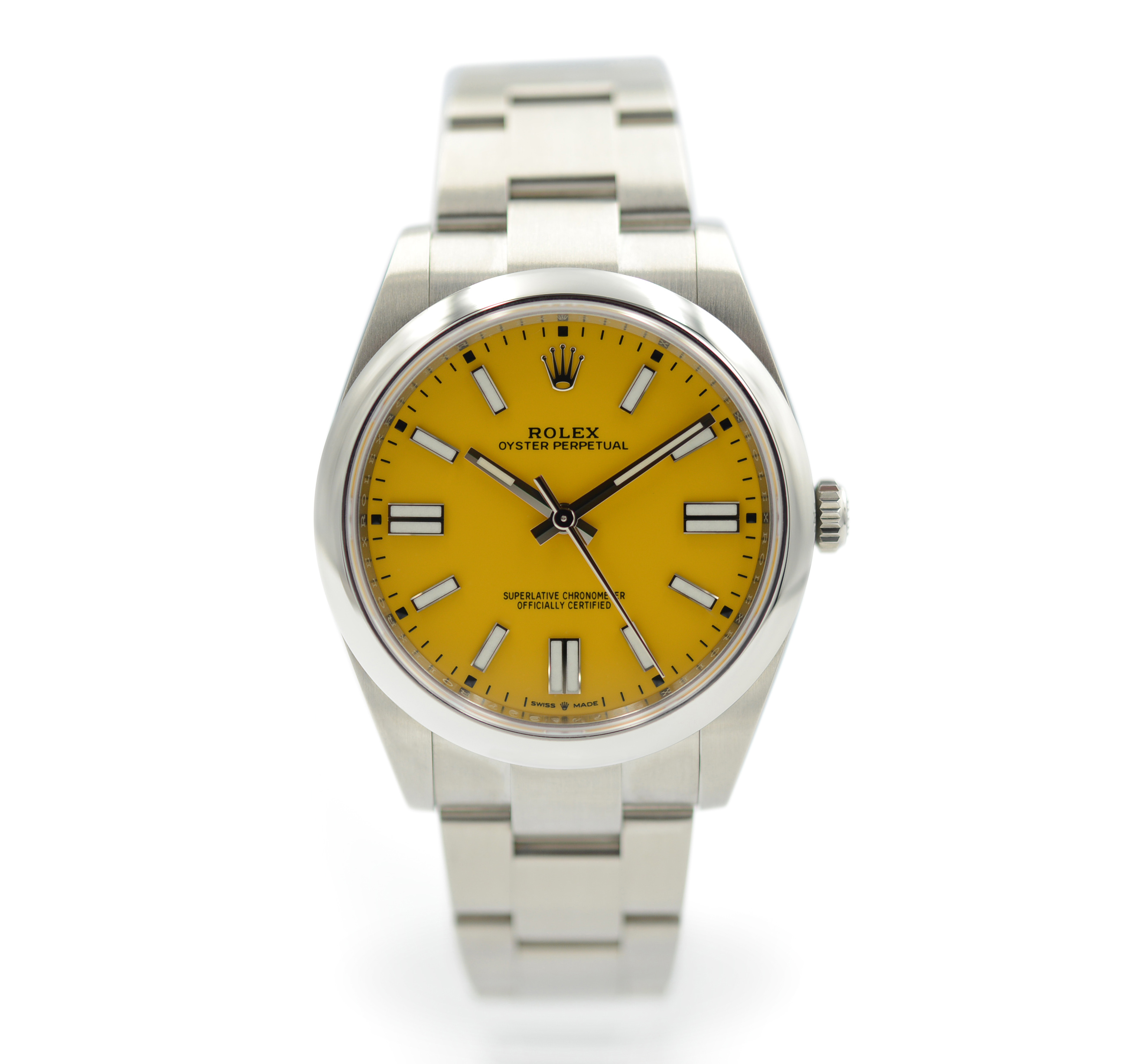 This Rolex Oyster Perpetual 124300 has a yellow baton dial and a bracelet strap. This Rolex has undergone a thorough inspection of water resistance, accuracy, functionality and condition to determine the level of reconditioning required to meet our strict standards. It has also been referenced against technical documents and manufacturer records where available to ensure authenticity and a clean history. Our watches have a 24-month warranty for your peace of mind, in conjunction with any remaining manufacturer’s warranty from new or from service. To maintain the manufacturer’s warranty on this watch, it has not been polished in our service centre.