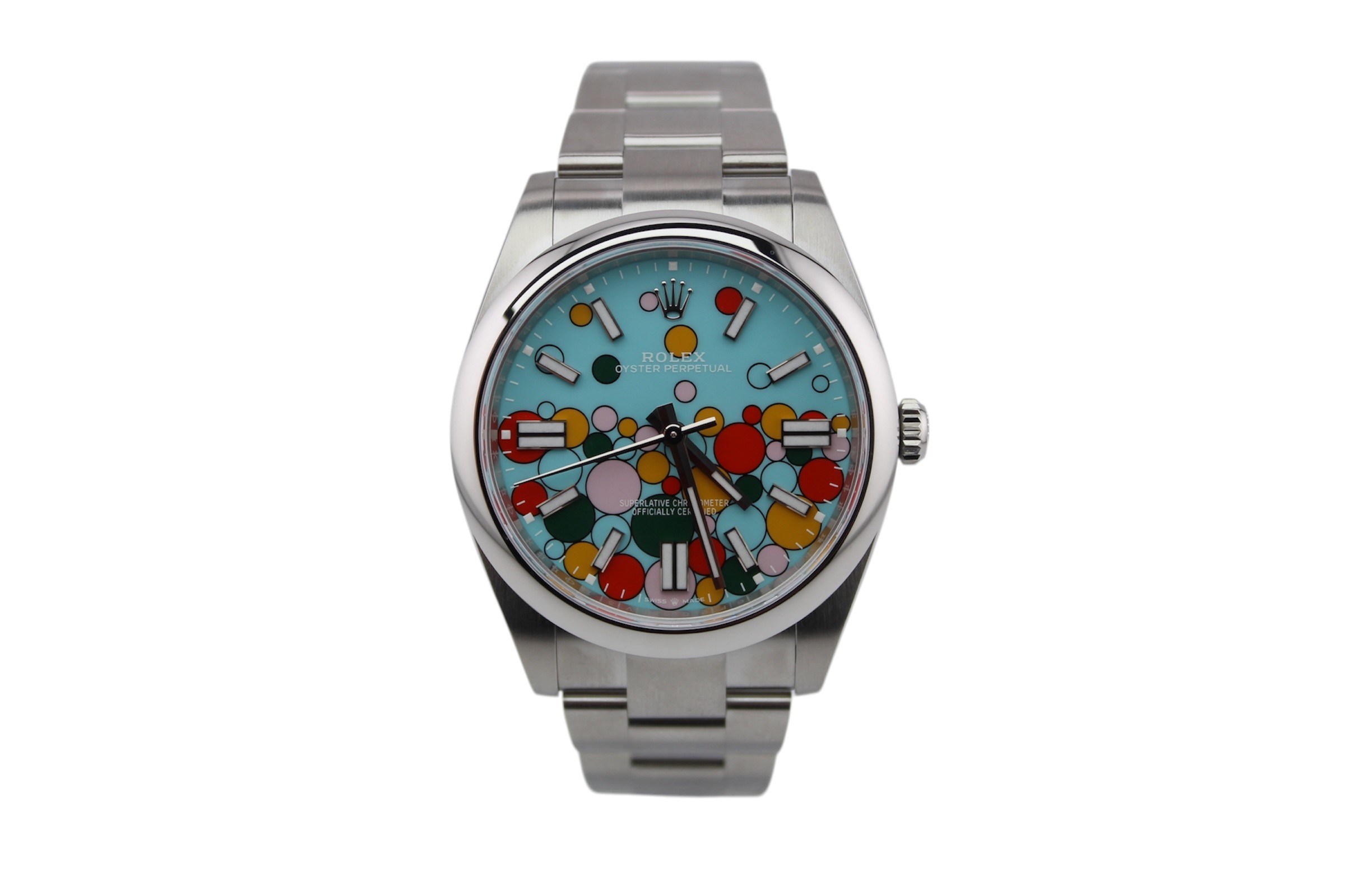 This Rolex Oyster Perpetual 124300 has a turquoise blue - celebration motif dial and a bracelet strap. This Rolex has undergone a thorough inspection of water resistance, accuracy, functionality and condition to determine the level of reconditioning required to meet our strict standards. It has also been referenced against technical documents and manufacturer records where available to ensure authenticity and a clean history. Our watches have a 24-month warranty for your peace of mind, in conjunction with any remaining manufacturer’s warranty from new or from service. To maintain the manufacturer’s warranty on this watch, it has not been polished in our service centre.