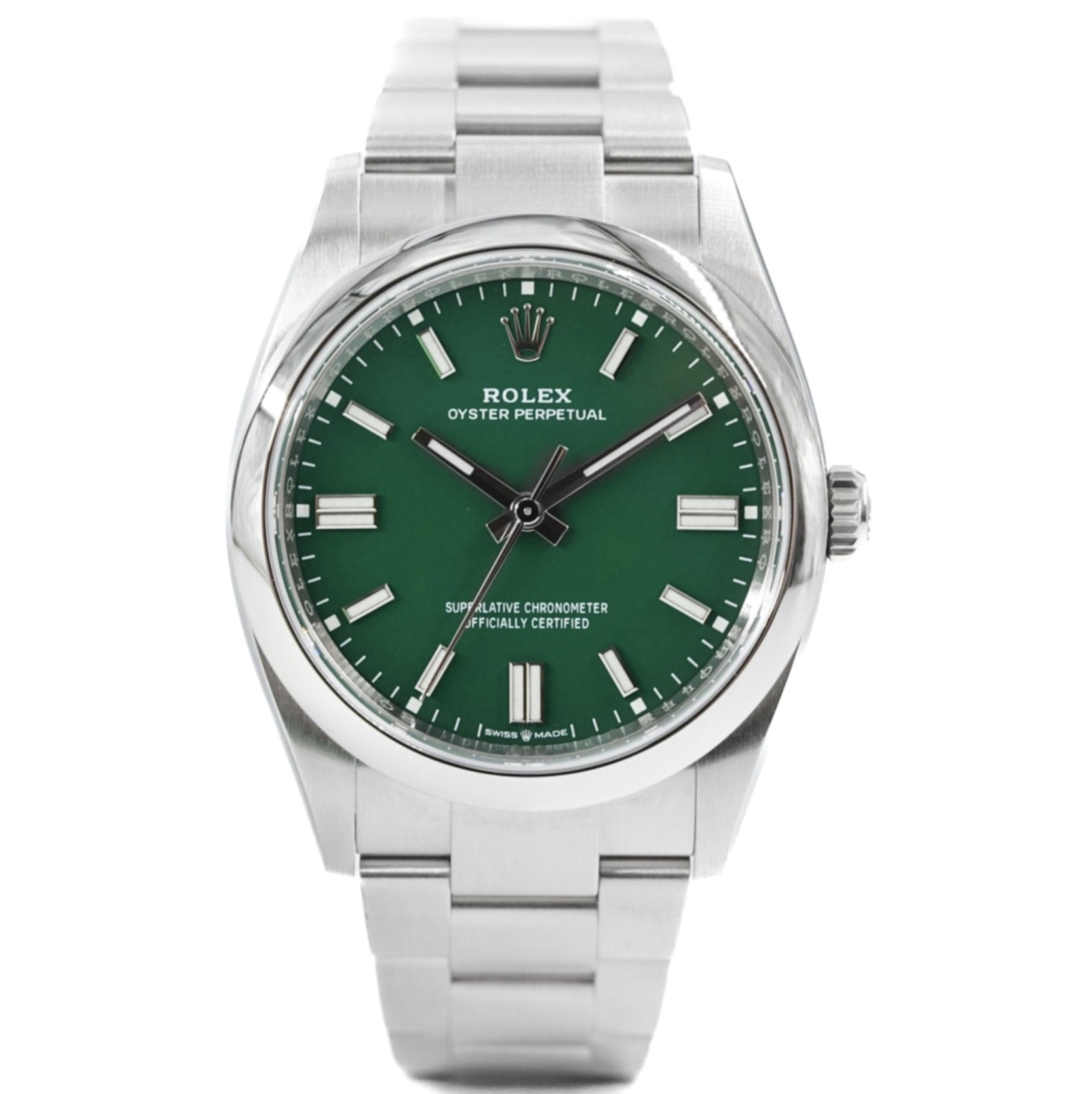 This Rolex Oyster Perpetual 126000 has a green baton dial and a bracelet strap. This Rolex has undergone a thorough inspection of water resistance, accuracy, functionality and condition to determine the level of reconditioning required to meet our strict standards. It has also been referenced against technical documents and manufacturer records where available to ensure authenticity and a clean history. Our watches have a 24-month warranty for your peace of mind, in conjunction with any remaining manufacturer’s warranty from new or from service. To maintain the manufacturer’s warranty on this watch, it has not been polished in our service centre.