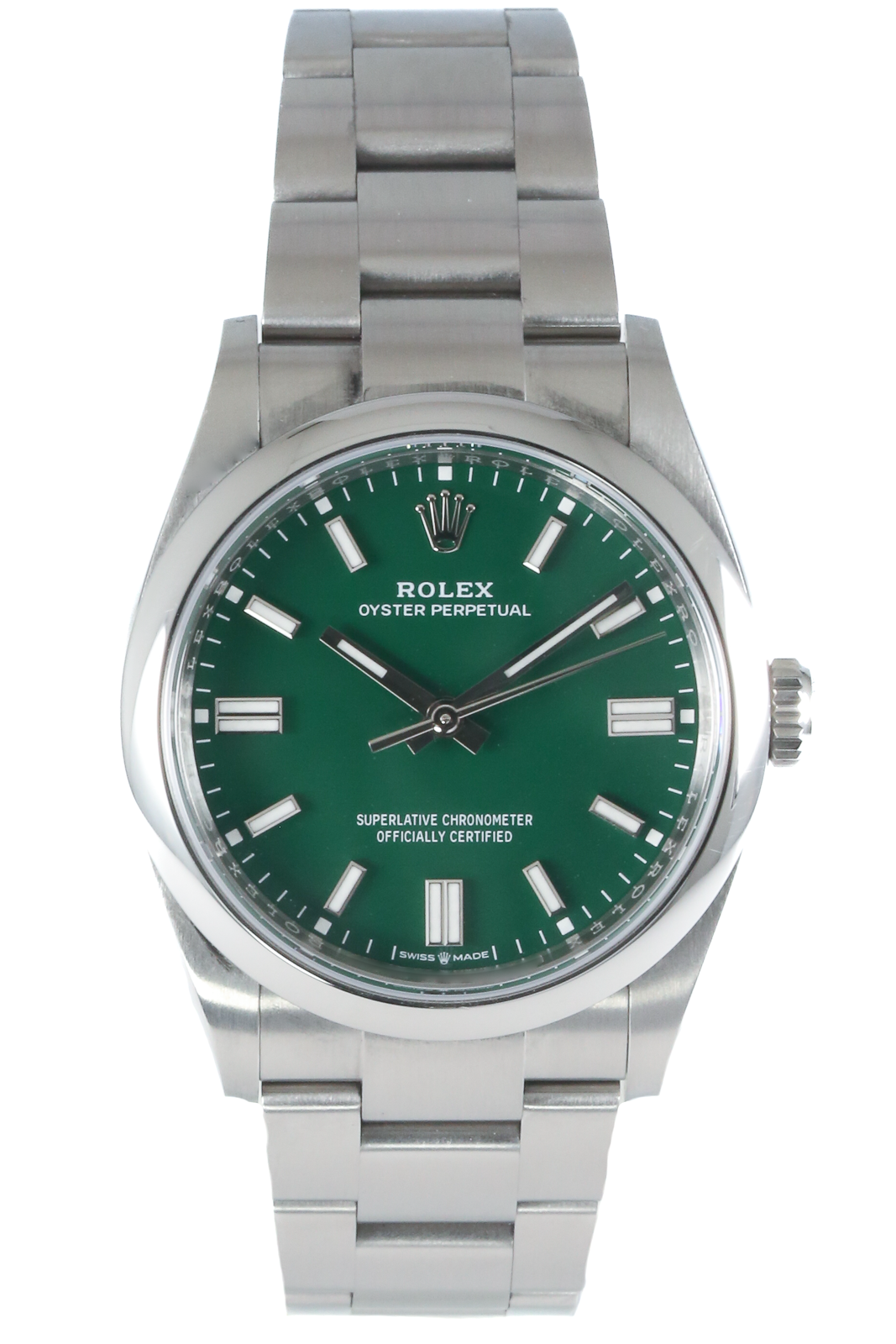 This Rolex Oyster Perpetual 126000 has a green baton dial and a bracelet strap. This Rolex has undergone a thorough inspection of water resistance, accuracy, functionality and condition to determine the level of reconditioning required to meet our strict standards. It has also been referenced against technical documents and manufacturer records where available to ensure authenticity and a clean history. Our watches have a 24-month warranty for your peace of mind, in conjunction with any remaining manufacturer’s warranty from new or from service. To maintain the manufacturer’s warranty on this watch, it has not been polished in our service centre.