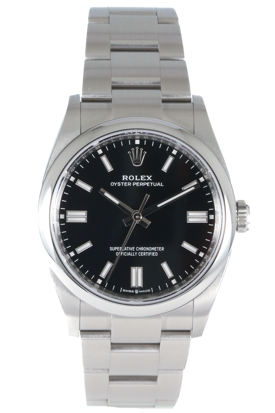 This Rolex Oyster Perpetual 126000 has a black baton dial and a bracelet strap. This Rolex has undergone a thorough inspection of water resistance, accuracy, functionality and condition to determine the level of reconditioning required to meet our strict standards. It has also been referenced against technical documents and manufacturer records where available to ensure authenticity and a clean history. Our watches have a 24-month warranty for your peace of mind, in conjunction with any remaining manufacturer’s warranty from new or from service. To maintain the manufacturer’s warranty on this watch, it has not been polished in our service centre.
