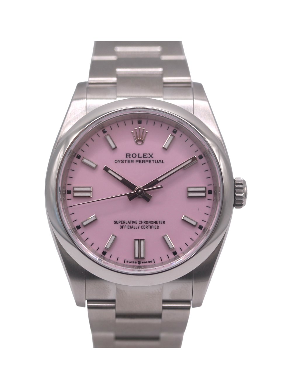 This Rolex Oyster Perpetual 126000 has a candy pink dial and a bracelet strap. This Rolex has undergone a thorough inspection of water resistance, accuracy, functionality and condition to determine the level of reconditioning required to meet our strict standards. It has also been referenced against technical documents and manufacturer records where available to ensure authenticity and a clean history. Our watches have a 24-month warranty for your peace of mind, in conjunction with any remaining manufacturer’s warranty from new or from service. To maintain the manufacturer’s warranty on this watch, it has not been polished in our service centre.
