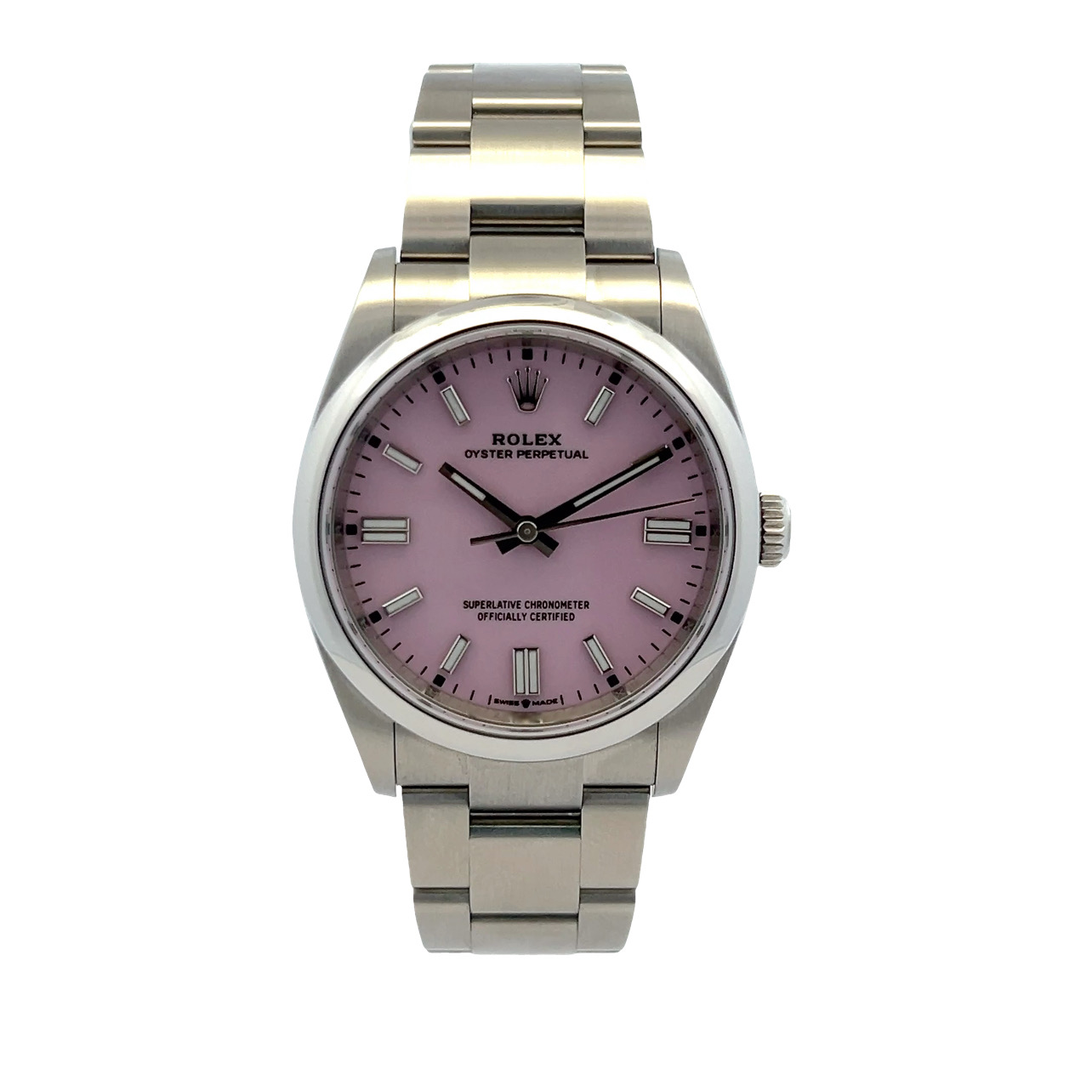 This Rolex Oyster Perpetual 126000 has a candy pink dial and a bracelet strap. This Rolex has undergone a thorough inspection of water resistance, accuracy, functionality and condition to determine the level of reconditioning required to meet our strict standards. It has also been referenced against technical documents and manufacturer records where available to ensure authenticity and a clean history. Our watches have a 24-month warranty for your peace of mind, in conjunction with any remaining manufacturer’s warranty from new or from service. To maintain the manufacturer’s warranty on this watch, it has not been polished in our service centre.