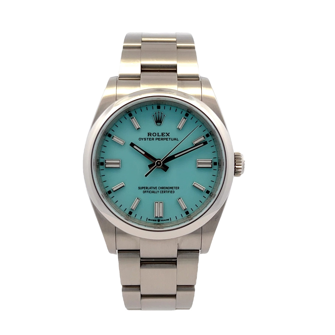 This Rolex Oyster Perpetual 126000 has a turquoise dial and a bracelet strap. This Rolex has undergone a thorough inspection of water resistance, accuracy, functionality and condition to determine the level of reconditioning required to meet our strict standards. It has also been referenced against technical documents and manufacturer records where available to ensure authenticity and a clean history. Our watches have a 24-month warranty for your peace of mind, in conjunction with any remaining manufacturer’s warranty from new or from service. To maintain the manufacturer’s warranty on this watch, it has not been polished in our service centre.