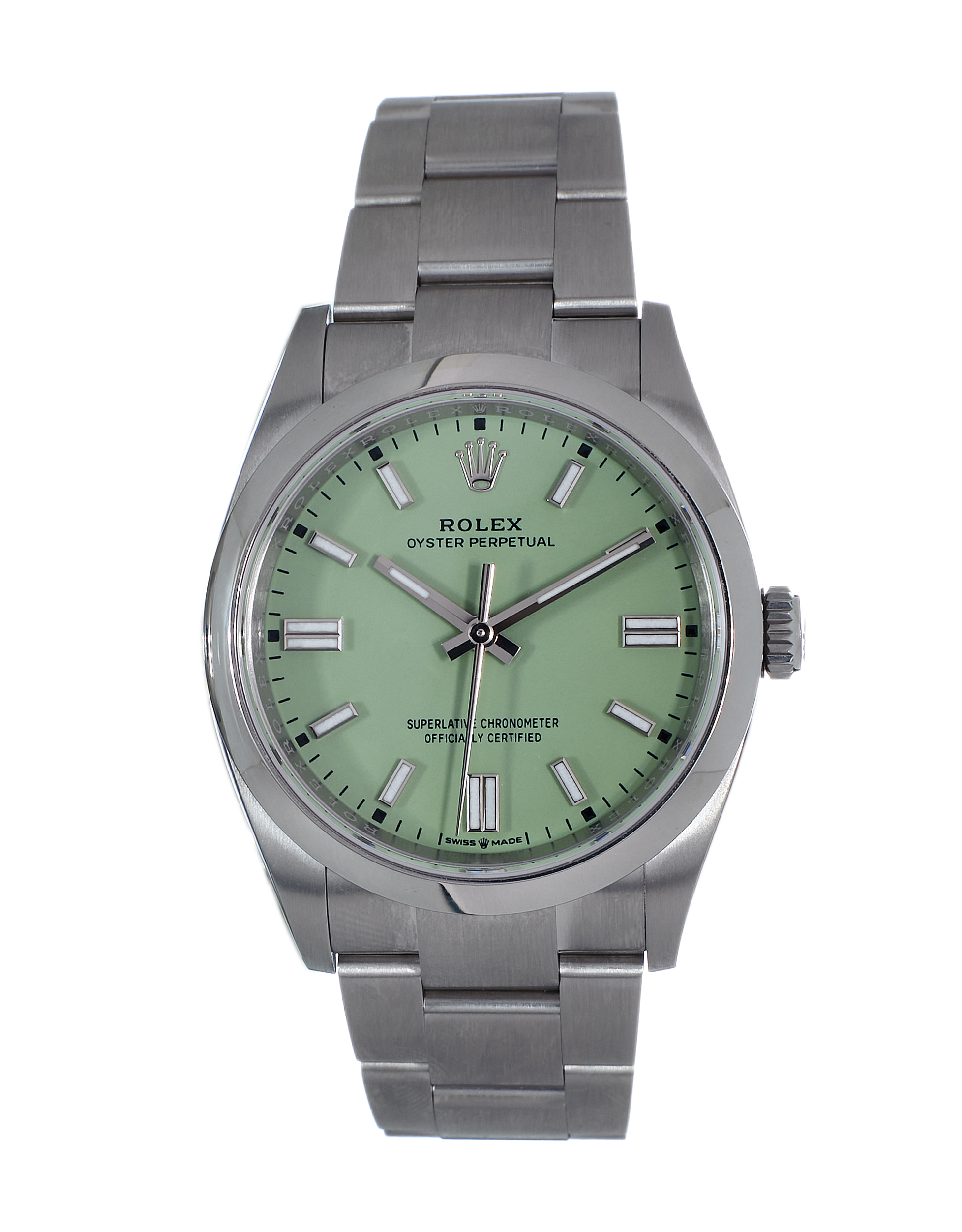 This Rolex Oyster Perpetual 126000 has a pistachio dial and a bracelet strap. This Rolex has undergone a thorough inspection of water resistance, accuracy, functionality and condition to determine the level of reconditioning required to meet our strict standards. It has also been referenced against technical documents and manufacturer records where available to ensure authenticity and a clean history. Our watches have a 24-month warranty for your peace of mind, in conjunction with any remaining manufacturer’s warranty from new or from service. To maintain the manufacturer’s warranty on this watch, it has not been polished in our service centre.