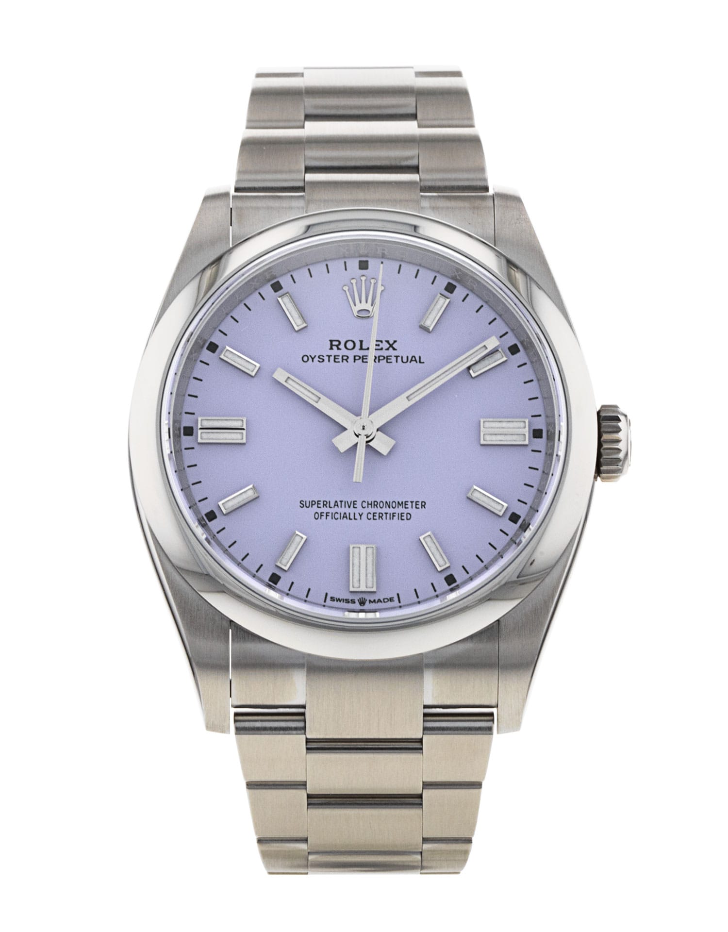 This Rolex Oyster Perpetual 126000 has a lavender dial and a bracelet strap. This Rolex has undergone a thorough inspection of water resistance, accuracy, functionality and condition to determine the level of reconditioning required to meet our strict standards. It has also been referenced against technical documents and manufacturer records where available to ensure authenticity and a clean history. Our watches have a 24-month warranty for your peace of mind, in conjunction with any remaining manufacturer’s warranty from new or from service. To maintain the manufacturer’s warranty on this watch, it has not been polished in our service centre.