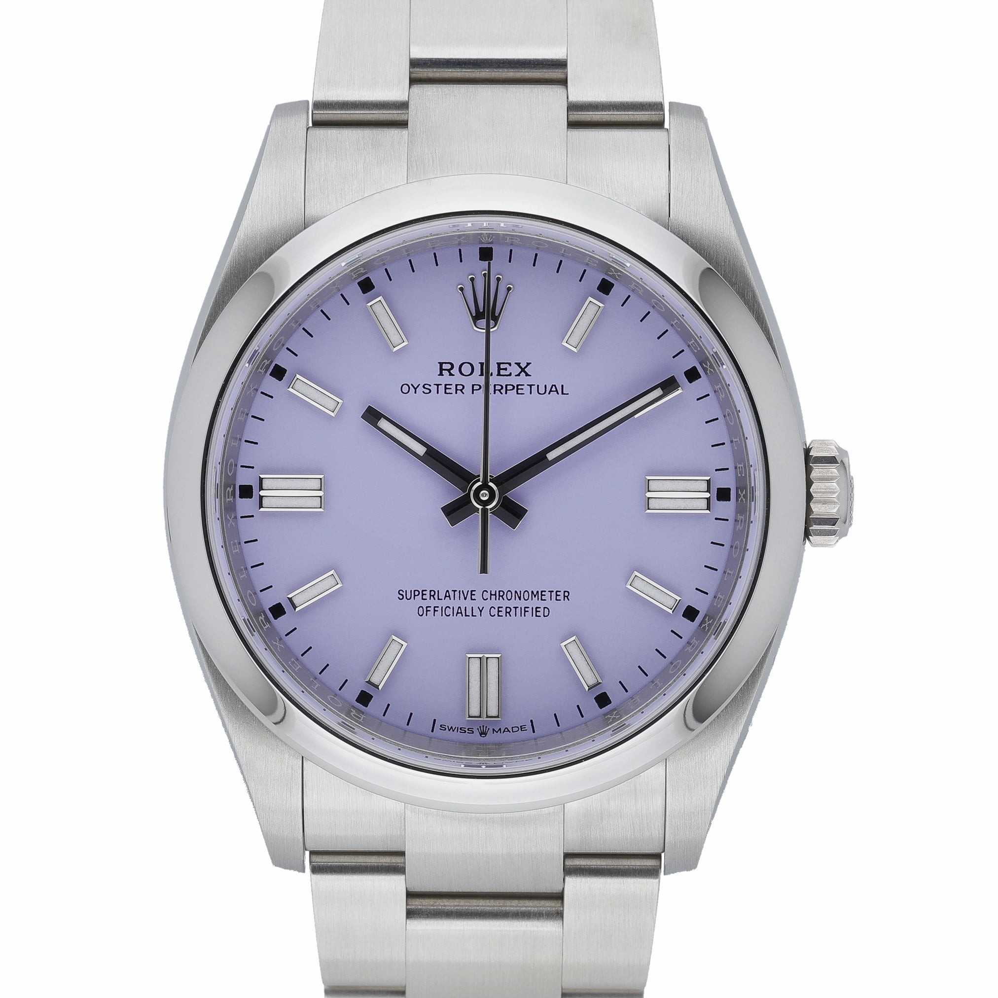 This Rolex Oyster Perpetual 126000 has a lavender dial and a bracelet strap. This Rolex has undergone a thorough inspection of water resistance, accuracy, functionality and condition to determine the level of reconditioning required to meet our strict standards. It has also been referenced against technical documents and manufacturer records where available to ensure authenticity and a clean history. Our watches have a 24-month warranty for your peace of mind, in conjunction with any remaining manufacturer’s warranty from new or from service. To maintain the manufacturer’s warranty on this watch, it has not been polished in our service centre.