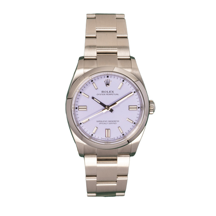 This Rolex Oyster Perpetual 126000 has a lavender dial and a bracelet strap. This Rolex has undergone a thorough inspection of water resistance, accuracy, functionality and condition to determine the level of reconditioning required to meet our strict standards. It has also been referenced against technical documents and manufacturer records where available to ensure authenticity and a clean history. Our watches have a 24-month warranty for your peace of mind, in conjunction with any remaining manufacturer’s warranty from new or from service. To maintain the manufacturer’s warranty on this watch, it has not been polished in our service centre.