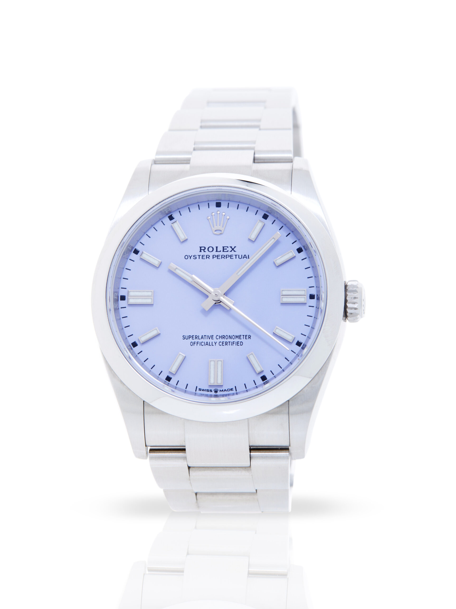 This Rolex Oyster Perpetual 126000 has a lavender dial and a bracelet strap. This Rolex has undergone a thorough inspection of water resistance, accuracy, functionality and condition to determine the level of reconditioning required to meet our strict standards. It has also been referenced against technical documents and manufacturer records where available to ensure authenticity and a clean history. Our watches have a 24-month warranty for your peace of mind, in conjunction with any remaining manufacturer’s warranty from new or from service. To maintain the manufacturer’s warranty on this watch, it has not been polished in our service centre.