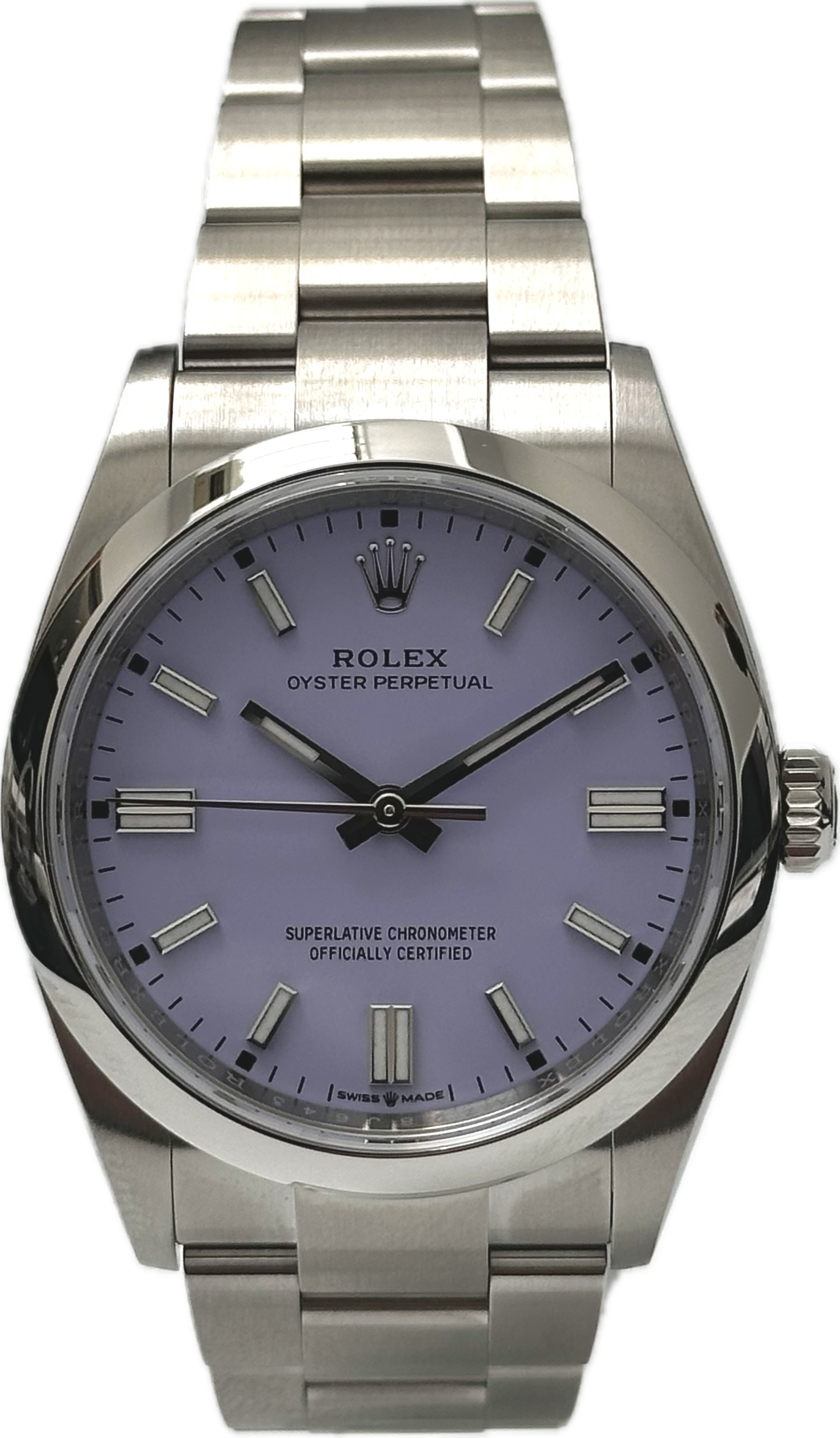 This Rolex Oyster Perpetual 126000 has a lavender dial and a bracelet strap. This Rolex has undergone a thorough inspection of water resistance, accuracy, functionality and condition to determine the level of reconditioning required to meet our strict standards. It has also been referenced against technical documents and manufacturer records where available to ensure authenticity and a clean history. Our watches have a 24-month warranty for your peace of mind, in conjunction with any remaining manufacturer’s warranty from new or from service. To maintain the manufacturer’s warranty on this watch, it has not been polished in our service centre.