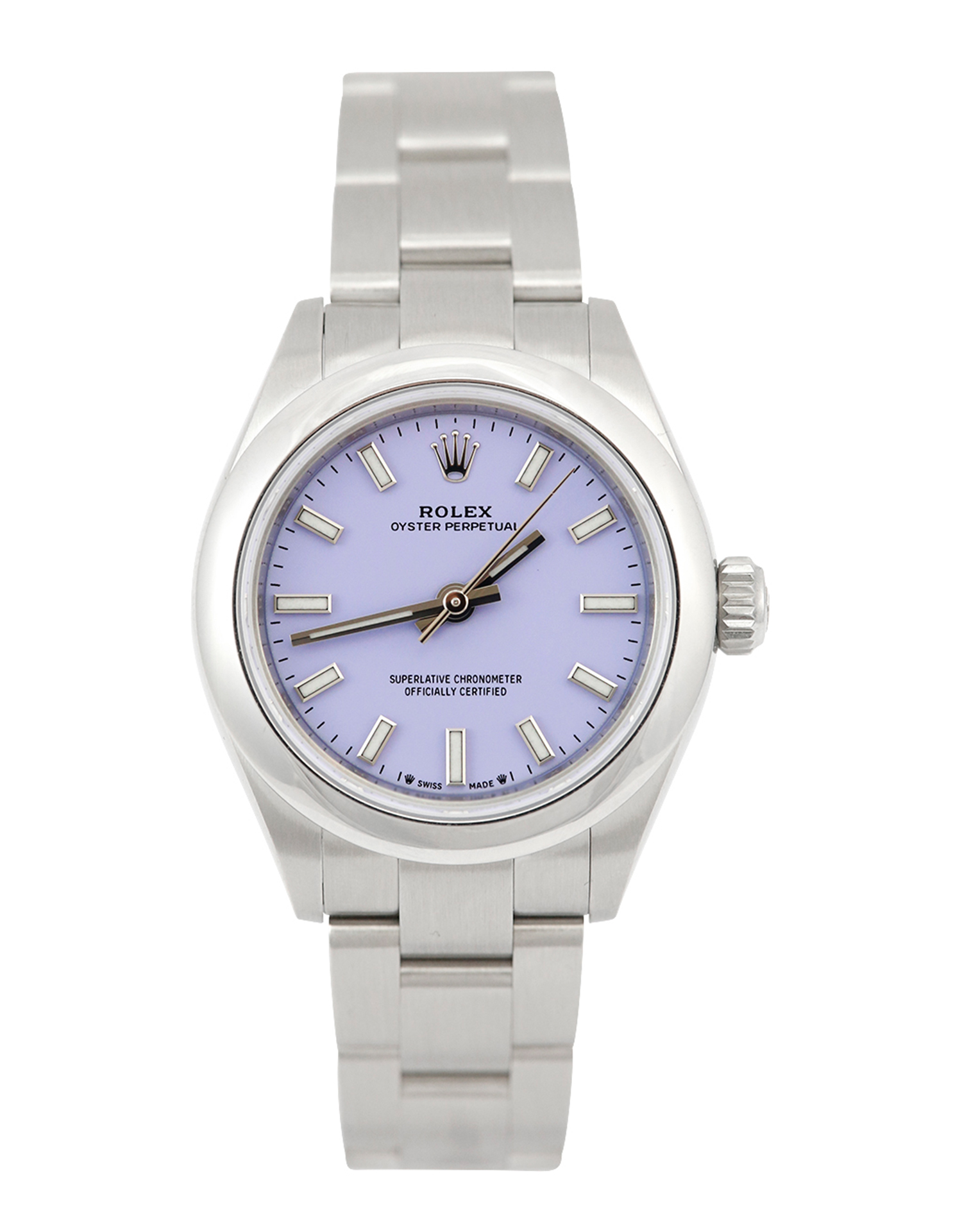 This Rolex Oyster Perpetual 276200 has a lavender dial and a bracelet strap. This Rolex has undergone a thorough inspection of water resistance, accuracy, functionality and condition to determine the level of reconditioning required to meet our strict standards. It has also been referenced against technical documents and manufacturer records where available to ensure authenticity and a clean history. Our watches have a 24-month warranty for your peace of mind, in conjunction with any remaining manufacturer’s warranty from new or from service. To maintain the manufacturer’s warranty on this watch, it has not been polished in our service centre.