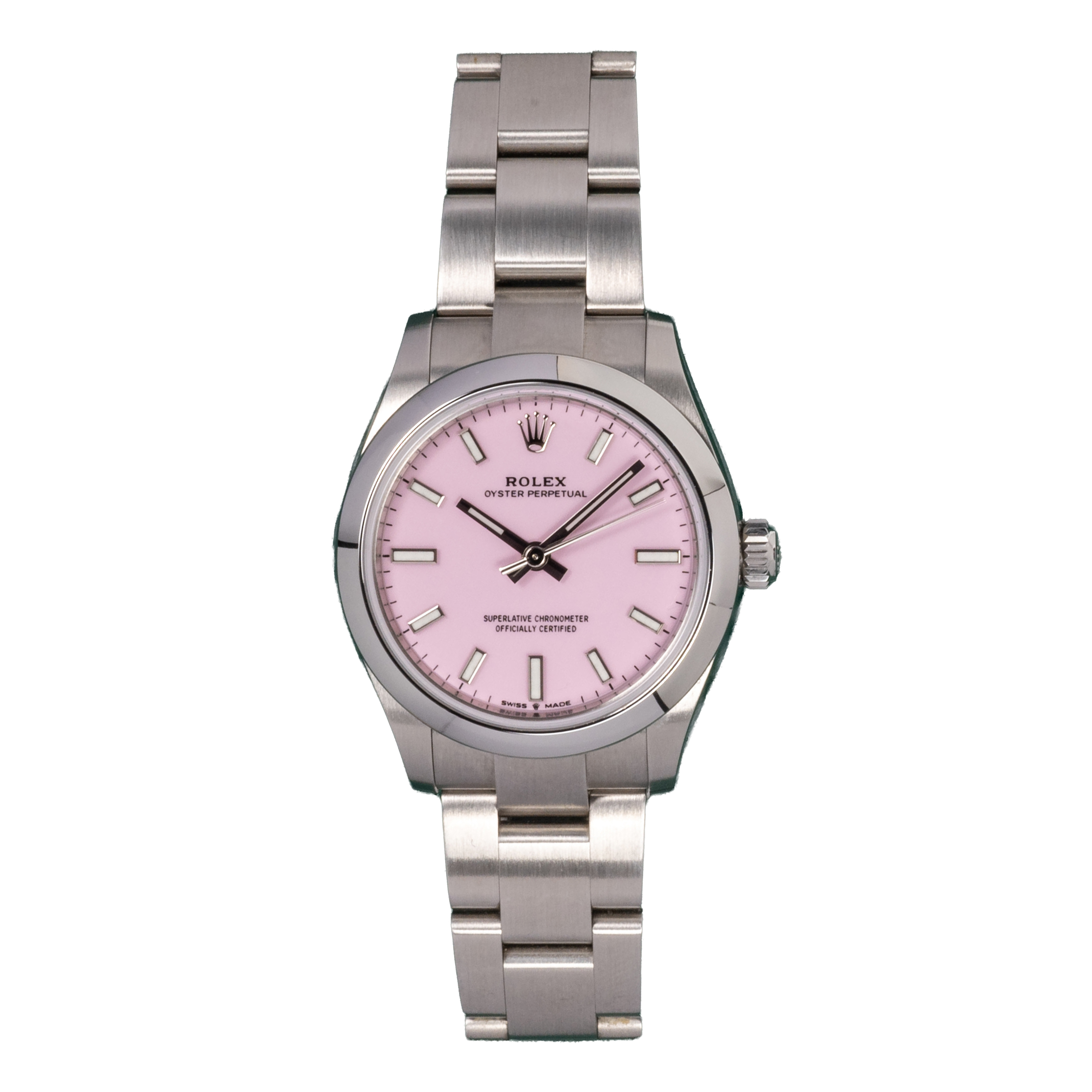 This Rolex Oyster Perpetual 277200 has a pink baton dial and a bracelet strap. This Rolex has undergone a thorough inspection of water resistance, accuracy, functionality and condition to determine the level of reconditioning required to meet our strict standards. It has also been referenced against technical documents and manufacturer records where available to ensure authenticity and a clean history. Our watches have a 24-month warranty for your peace of mind, in conjunction with any remaining manufacturer’s warranty from new or from service. To maintain the manufacturer’s warranty on this watch, it has not been polished in our service centre.