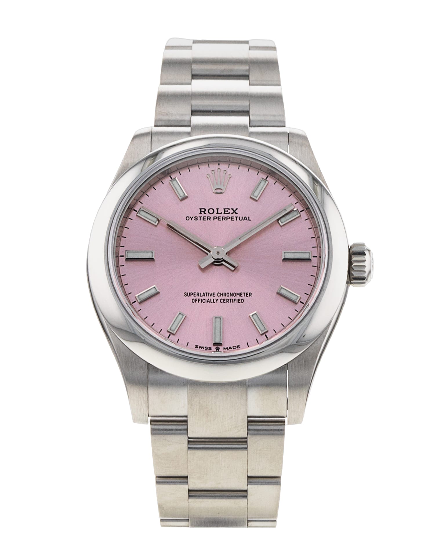 This Rolex Oyster Perpetual 277200 has a pink baton dial and a bracelet strap. This Rolex has undergone a thorough inspection of water resistance, accuracy, functionality and condition to determine the level of reconditioning required to meet our strict standards. It has also been referenced against technical documents and manufacturer records where available to ensure authenticity and a clean history. All our watches have a 24-month warranty for your peace of mind. One of our skilled polishing technicians has removed marks on the case and bracelet of this watch, brought about by daily wear and tear, which is why this watch does not come with the remaining manufacturer’s warranty.
