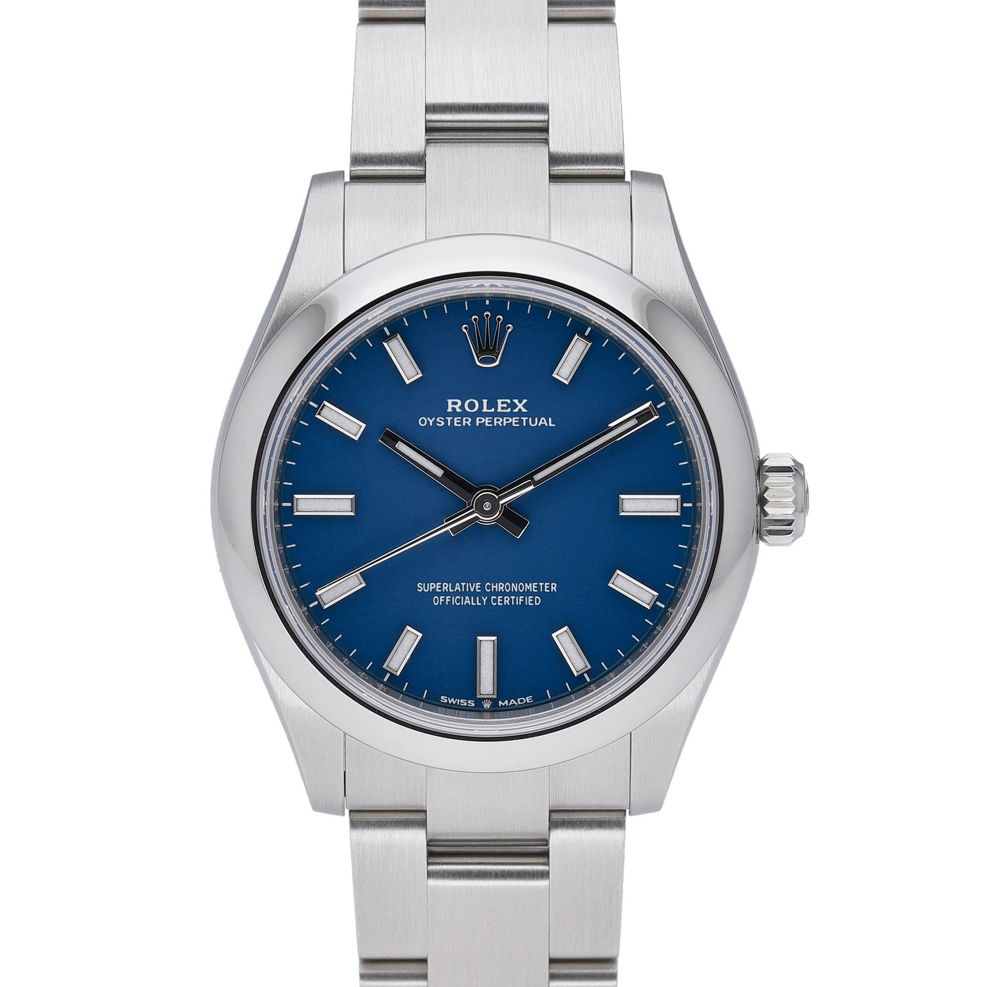 This Rolex Oyster Perpetual 277200 has a blue baton dial and a bracelet strap. This Rolex has undergone a thorough inspection of water resistance, accuracy, functionality and condition to determine the level of reconditioning required to meet our strict standards. It has also been referenced against technical documents and manufacturer records where available to ensure authenticity and a clean history. Our watches have a 24-month warranty for your peace of mind, in conjunction with any remaining manufacturer’s warranty from new or from service. To maintain the manufacturer’s warranty on this watch, it has not been polished in our service centre.