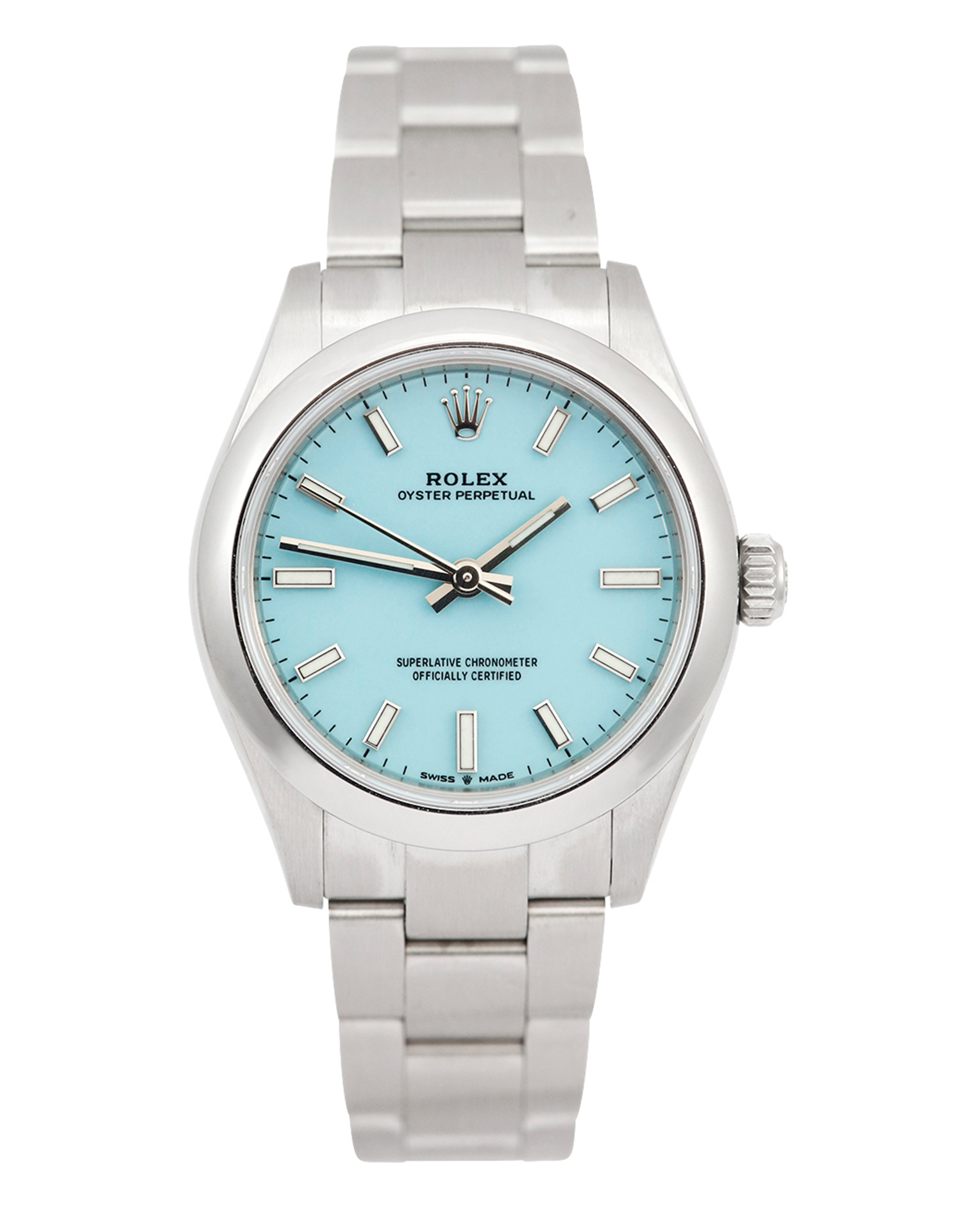 This Rolex Oyster Perpetual 277200 has a turquoise dial and a bracelet strap. This Rolex has undergone a thorough inspection of water resistance, accuracy, functionality and condition to determine the level of reconditioning required to meet our strict standards. It has also been referenced against technical documents and manufacturer records where available to ensure authenticity and a clean history. Our watches have a 24-month warranty for your peace of mind, in conjunction with any remaining manufacturer’s warranty from new or from service. To maintain the manufacturer’s warranty on this watch, it has not been polished in our service centre.