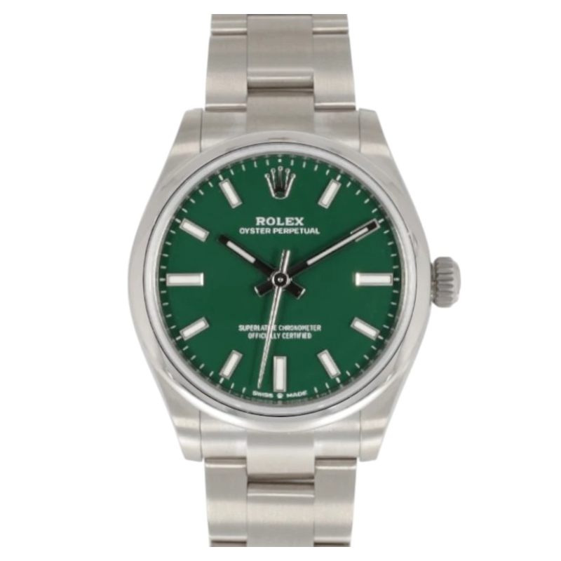 This Rolex Oyster Perpetual 277200 has a green baton dial and a bracelet strap. This Rolex has undergone a thorough inspection of water resistance, accuracy, functionality and condition to determine the level of reconditioning required to meet our strict standards. It has also been referenced against technical documents and manufacturer records where available to ensure authenticity and a clean history. Our watches have a 24-month warranty for your peace of mind, in conjunction with any remaining manufacturer’s warranty from new or from service. To maintain the manufacturer’s warranty on this watch, it has not been polished in our service centre.